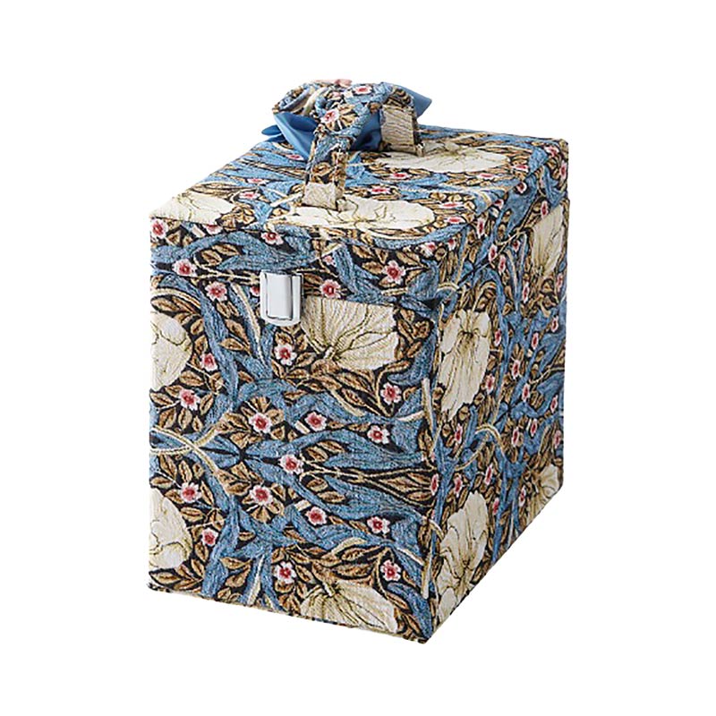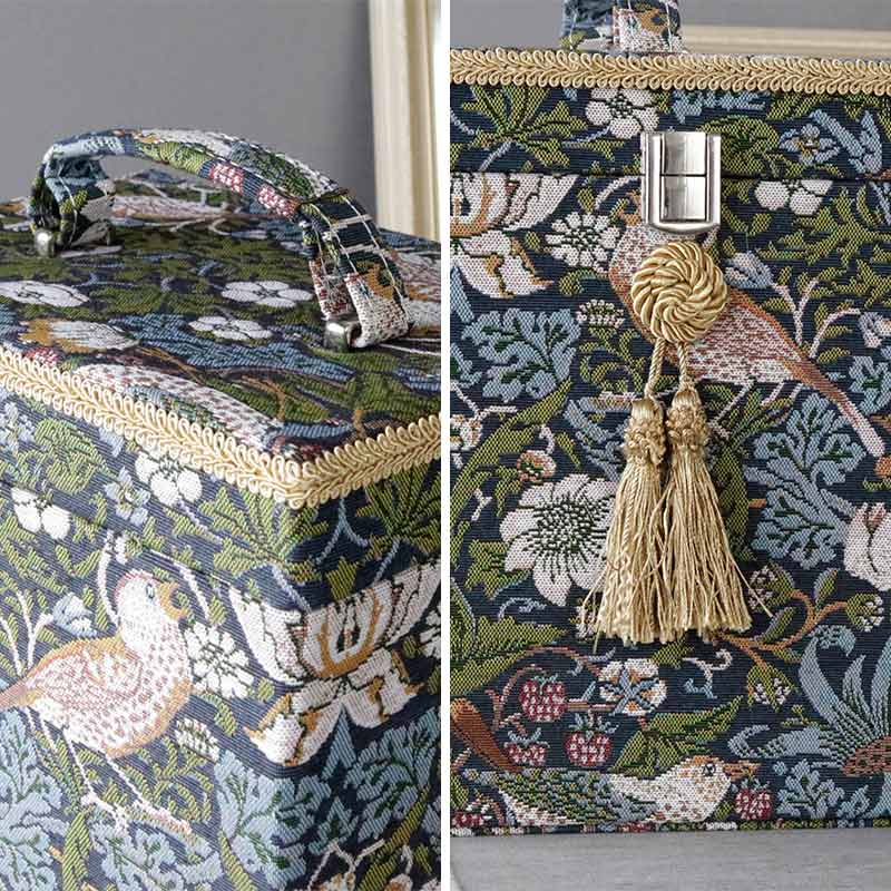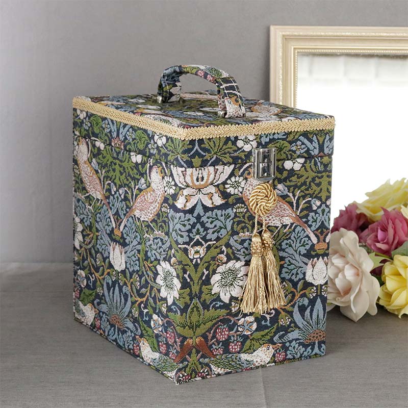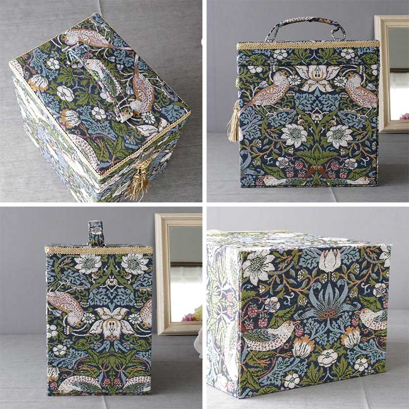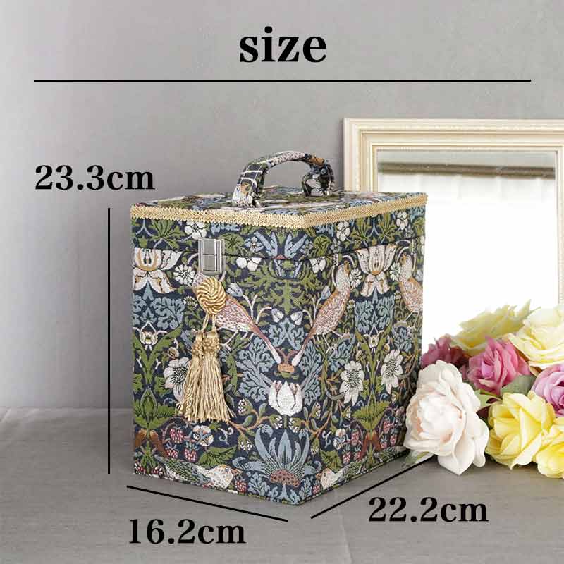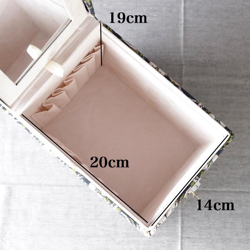 ロイヤルアーデンのファブリックインテリアの鏡付きメイクボックスになります。持ち手もついているので、持ち運びにも便利です。