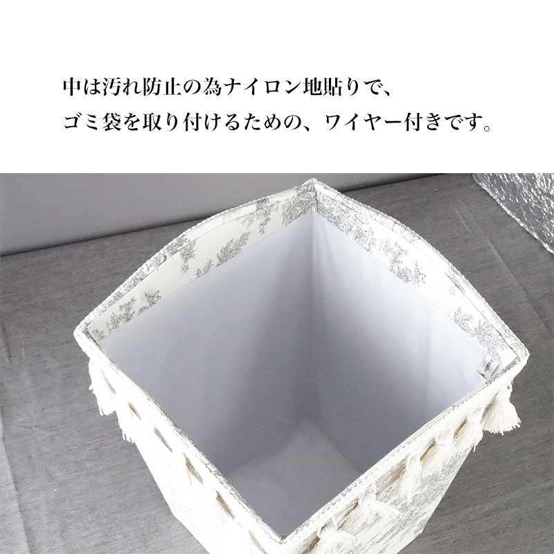 内側は汚れ防止の為ナイロン地貼りで、ゴミ袋を取り付けるためのワイヤー付きです。
