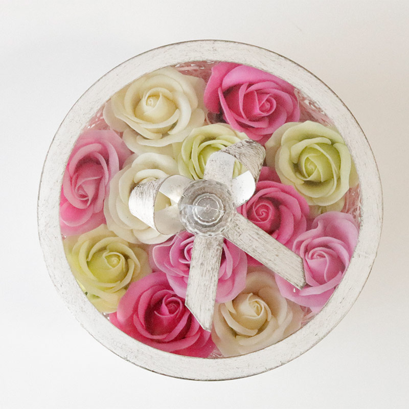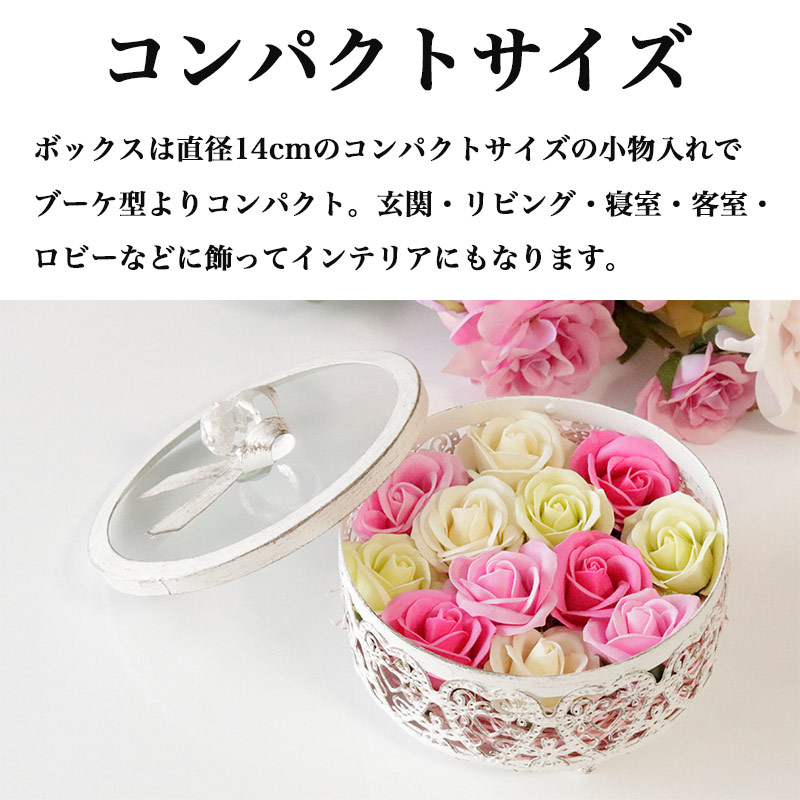 ボックスは直径14cmのコンパクトサイズの小物入れでブーケ型よりコンパクト。玄関・リビング・寝室・客室・ロビーなどに飾ってインテリアになります。