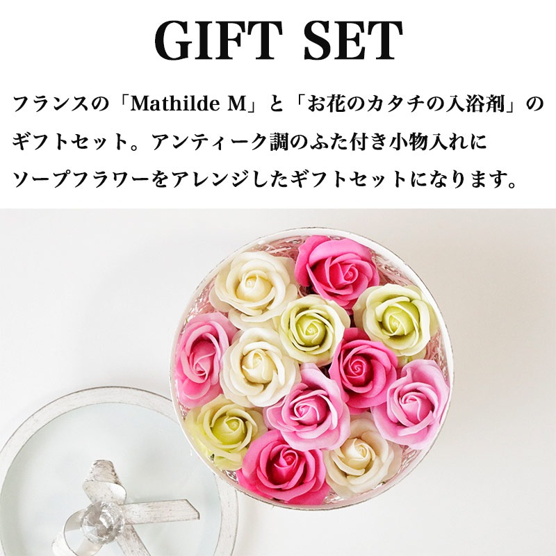 フランスのフレグランス&インテリアブランド「Mathilde M」と「お花のカタチの入浴剤」のギフトセット。アンティーク調のふた付き小物入れにソープフラワーをアレンジしたギフトセットになります。