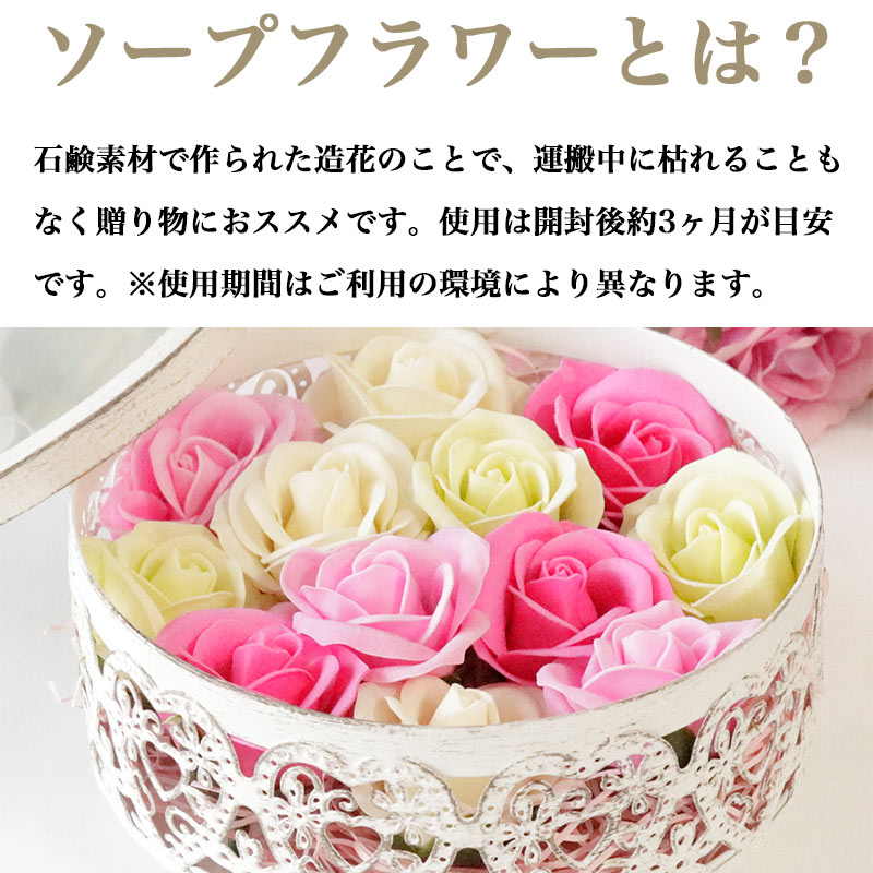 石鹸素材で作られた造花のことで、運搬中に枯れることもなく贈り物におススメです。使用は開封後、約3ヶ月が目安です。