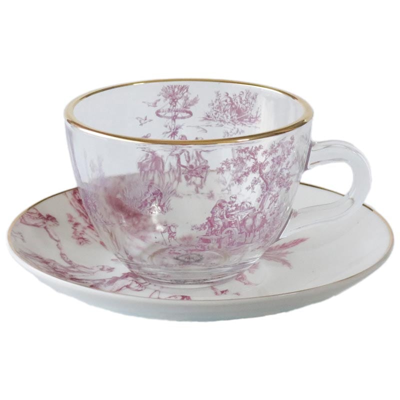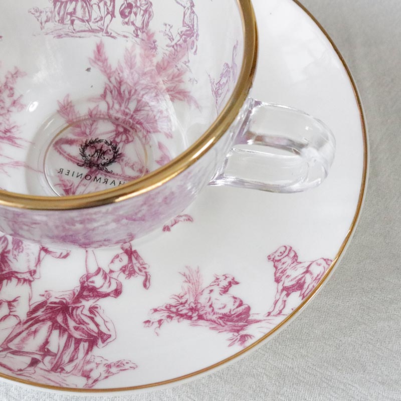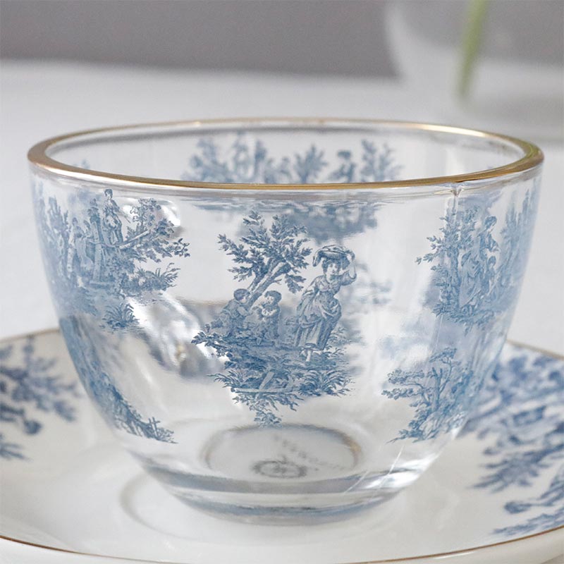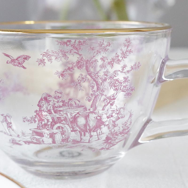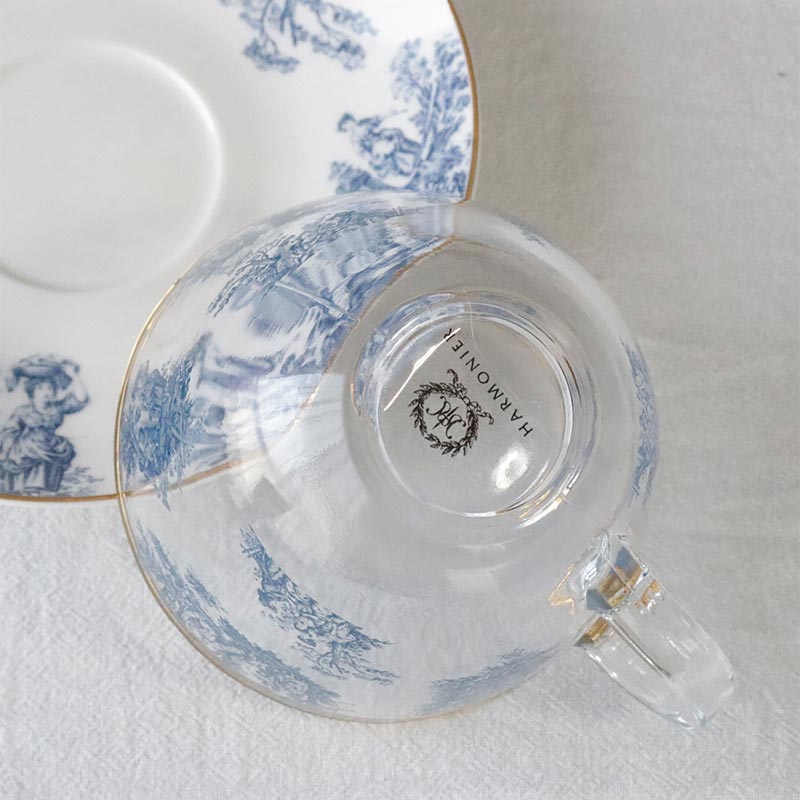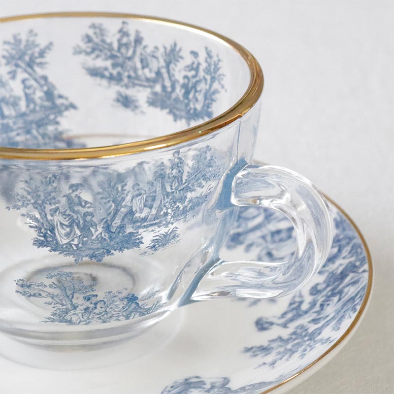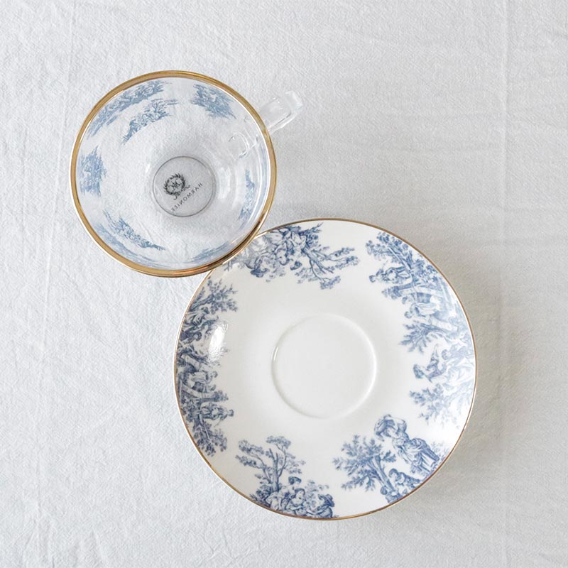 同じ柄の陶器製ソーサーとセットで、ホットドリンクも入れられるので、季節を問わずティータイムのおもてなしやアフタヌーンティーのコーディネートに活躍します。