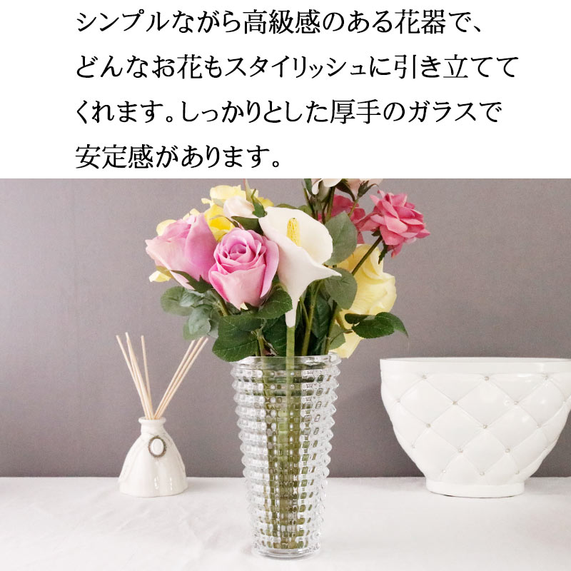 シンプルながら高級感のある花器で、どんなお花もスタイリッシュに引き立ててくれます。しっかりとした厚手のガラスで安定感があります。