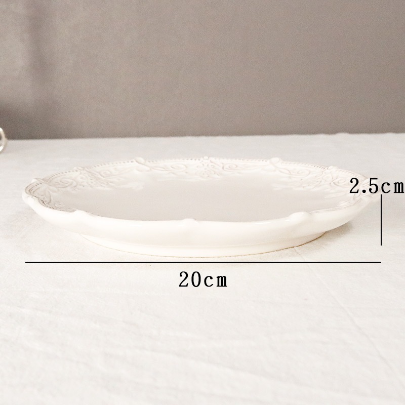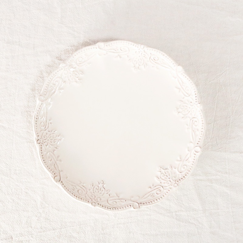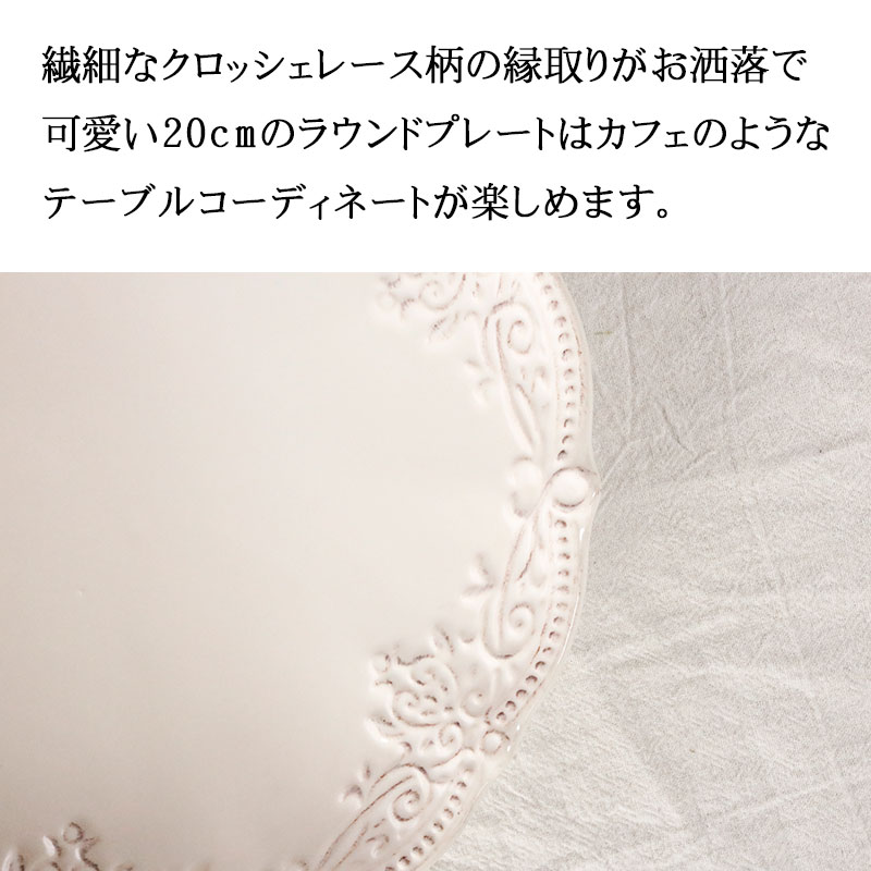 繊細なクロッシェレース柄の縁取りがお洒落でで可愛い20cmのラウンドプレートはカフェのようなテーブルコーディネートが楽しめます。