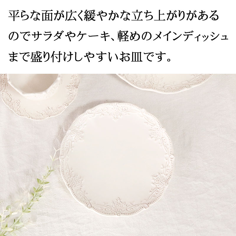 平らな面が広く緩やかな立ち上がりがあるのでサラダやケーキ、軽めのメインディッシュまで盛り付けしやすいお皿です。