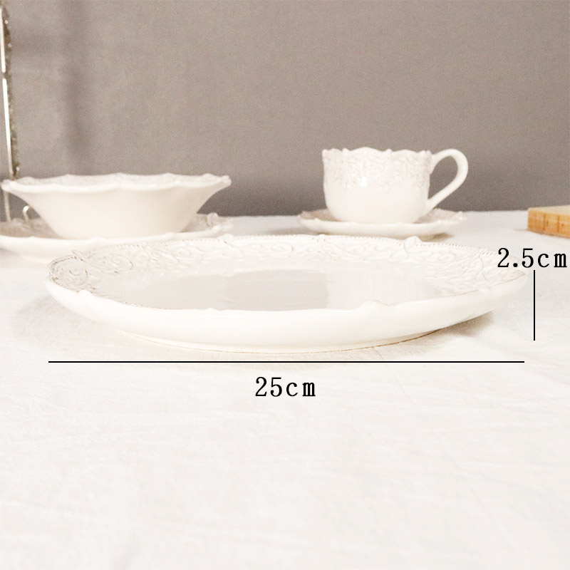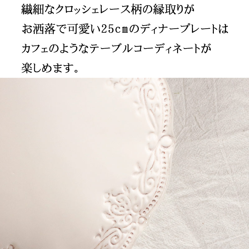 繊細なクロッシェレース柄の縁取りがお洒落で可愛い25cmのディナープレートはカフェのようなテーブルコーディネートが楽しめます。