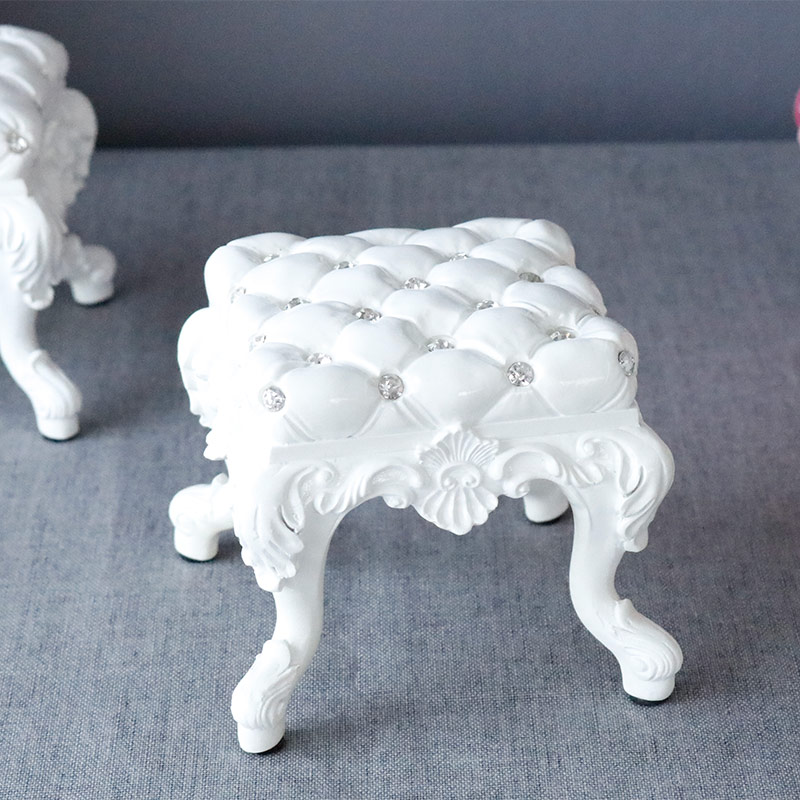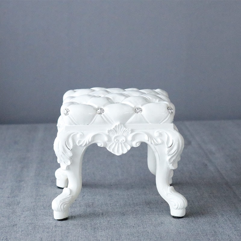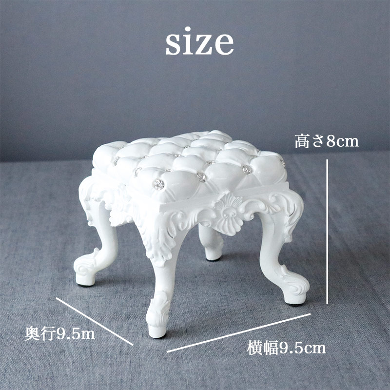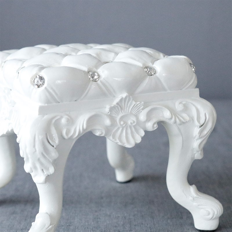 ラインストーンを散りばめたロマンチックでおしゃれな椅子のミニチュアのオブジェです。キルティング風の座面にアラベスク柄のレリーフと猫脚、クラシカルなロココ調デザイン。コンパクトですが飾っておくだけで華やかなになる置き物。人形やぬいぐるみ、お花やキャンドルホルダーと合わせても可愛いです。
