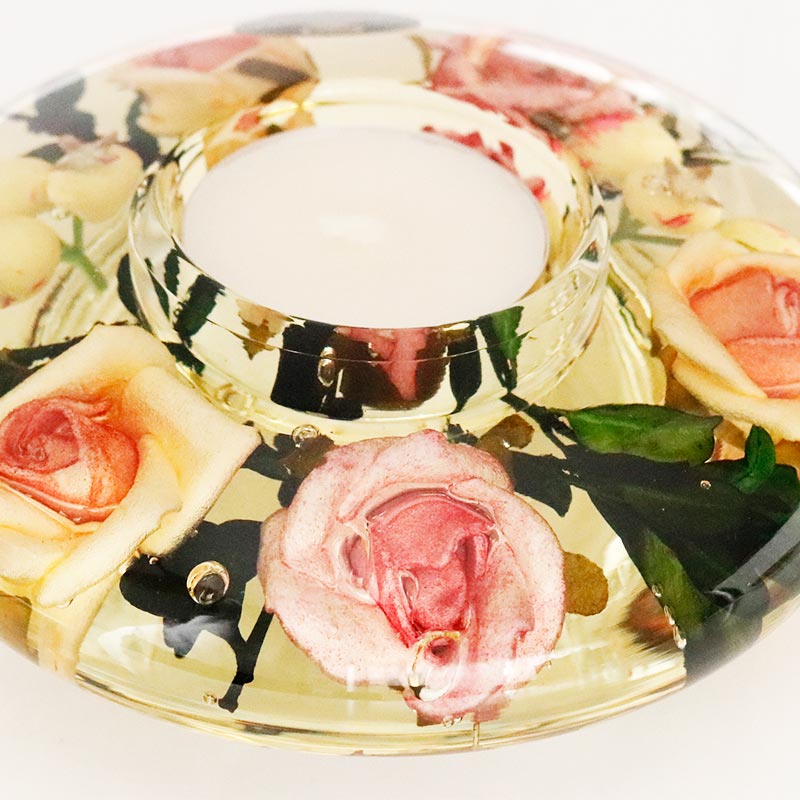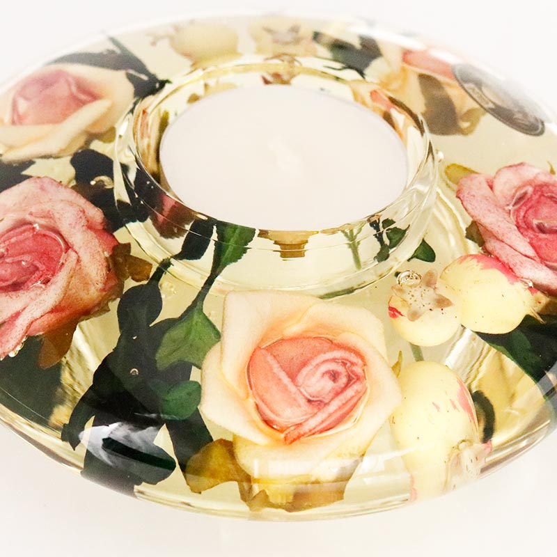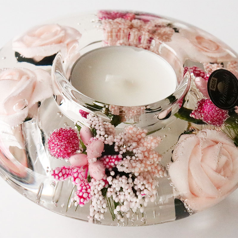 電気を消してキャンドルの灯りを楽しんだり、ガラスの器にアレンジされたアーティフィシャルフラワーをお楽しみください。
