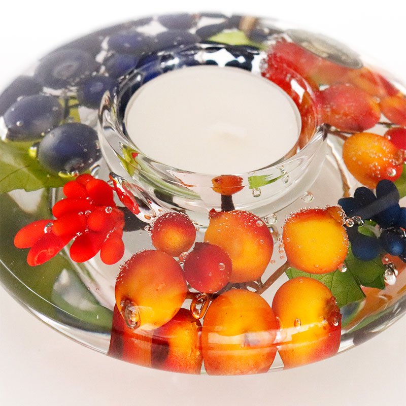 マウスブロウで形成されたガラスの器に彩り豊かな花々や、植物、フルーツなどのモチーフやビーズが封じ込められたデザイン。
