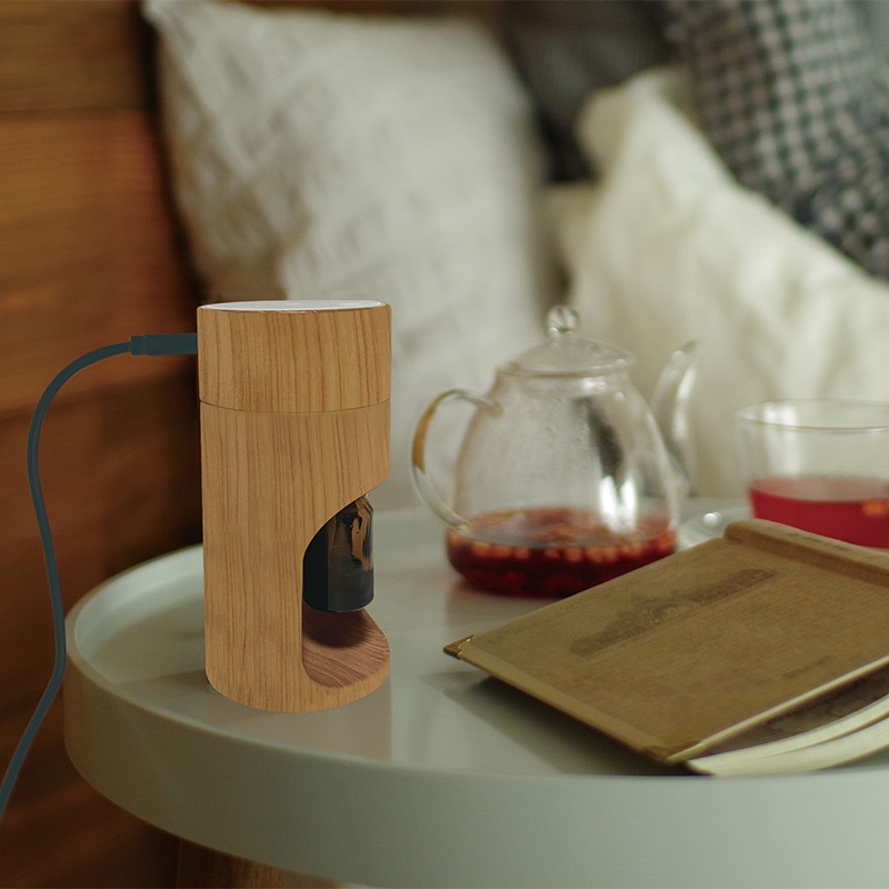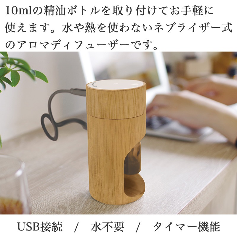 10mlの精油ボトルを取り付けてお手軽に使えます。水や熱を使わないネブライザー式のアロマディフューザーです。