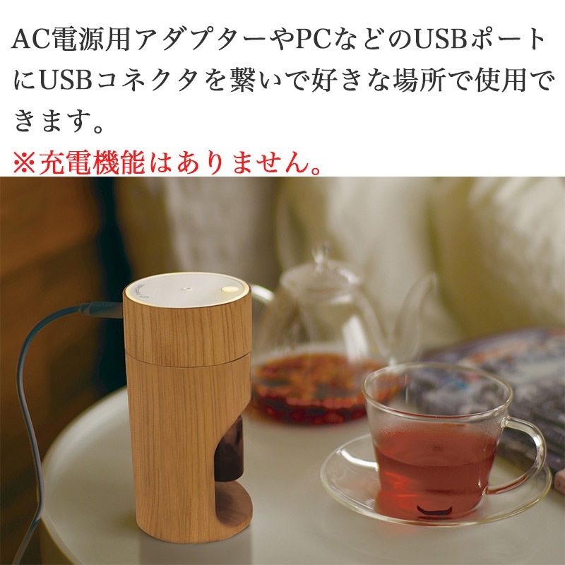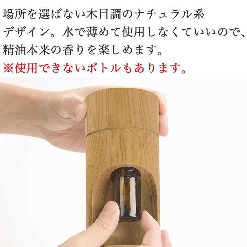 場所を選ばない木目調のナチュラル系デザイン。水で薄めて使用しなくていいので、精油本来の香りを楽しめます。