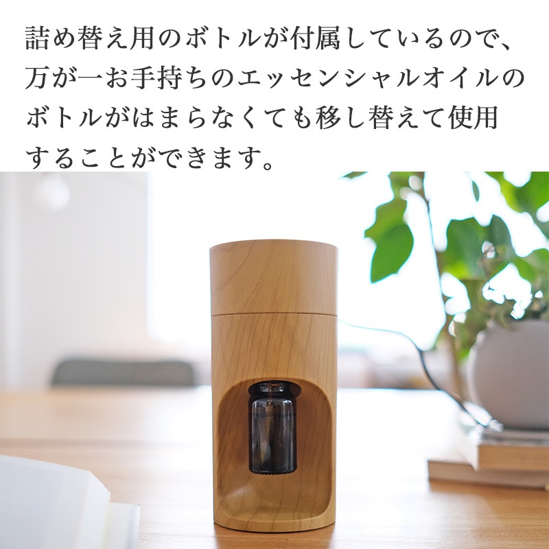 詰め替え用のボトルが付属しているので、万が一お手持ちのエッセンシャルオイルのボトルがはまらなくても移し替えて使用することができます。