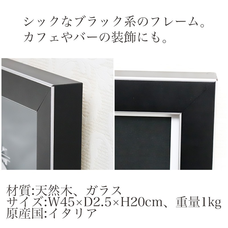 シックなブラック系のフレームでカフェやバーなどお店のディスプレイ装飾やホテルやオフィスのロビーの飾りにもにおすすめです。