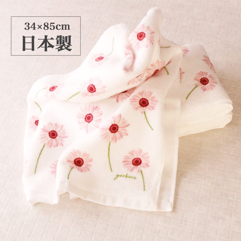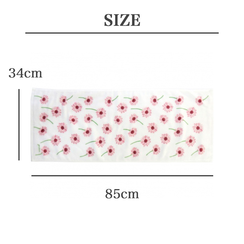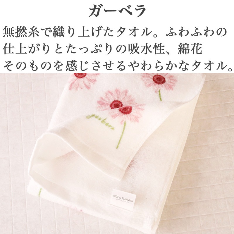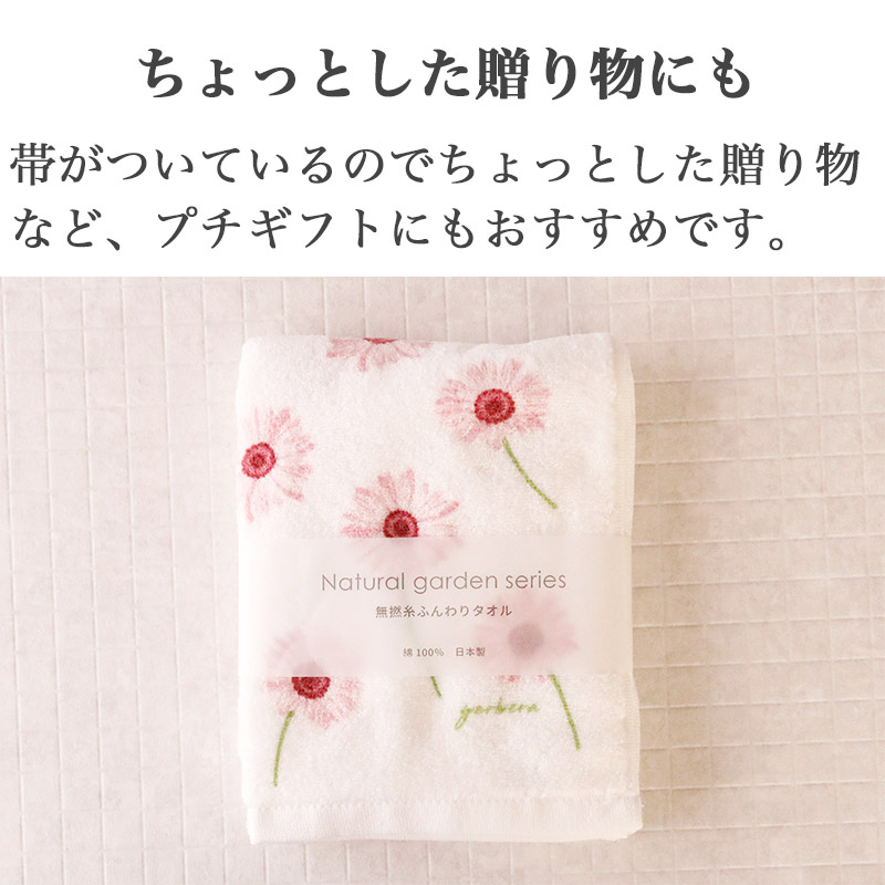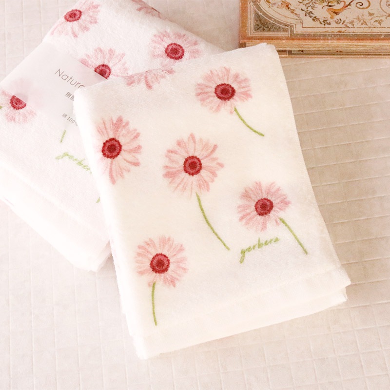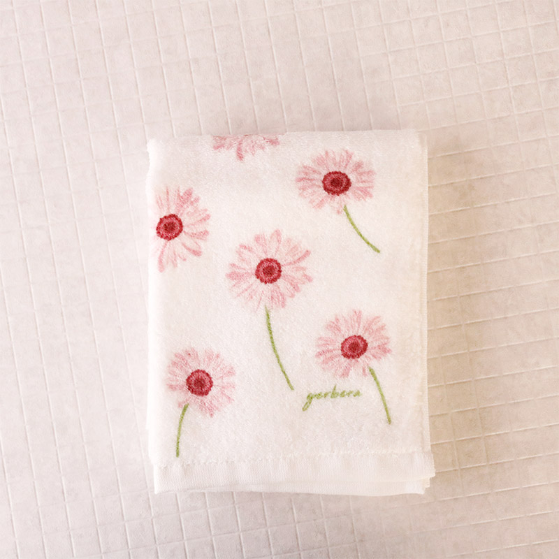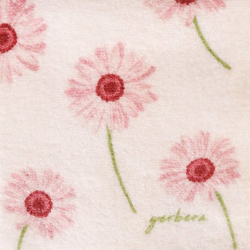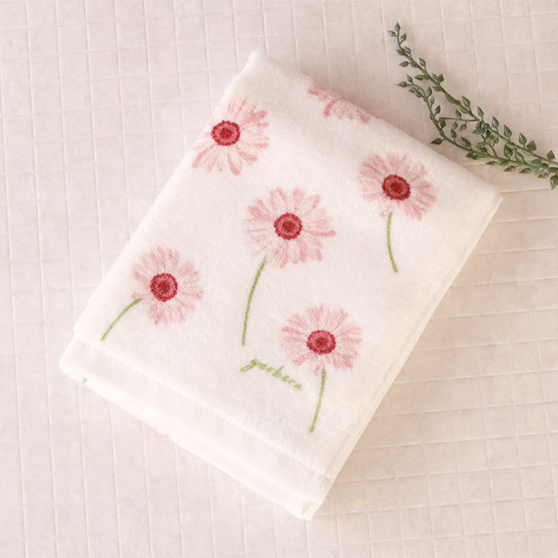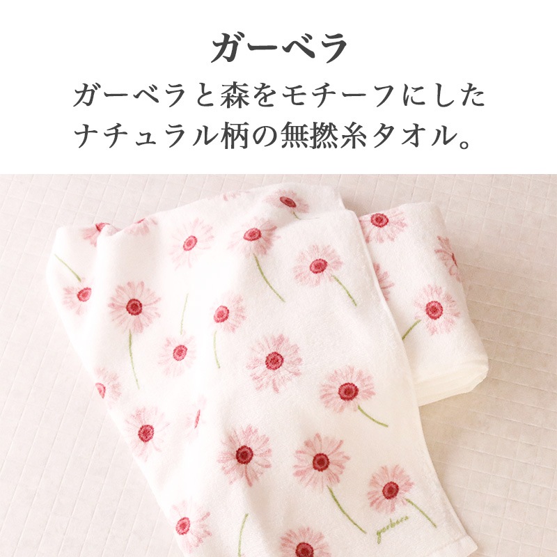 ガーベラと森をモチーフにしたナチュラル柄の無撚糸タオル。