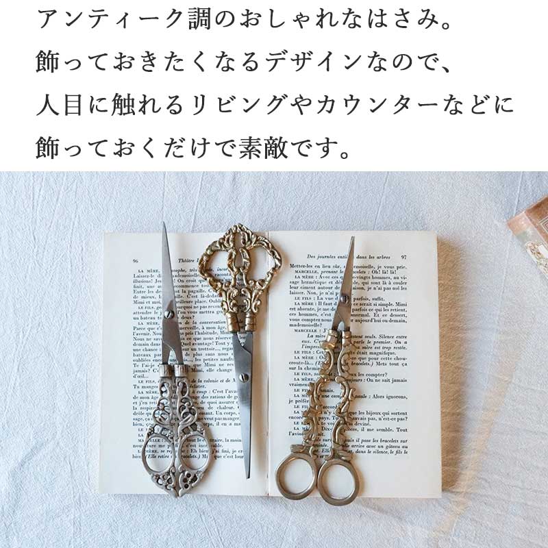 アンティーク調のおしゃれなはさみ。飾っておきたくなるデザインなので、人目に触れるリビングやカウンターなどに飾っておくだけで素敵です。