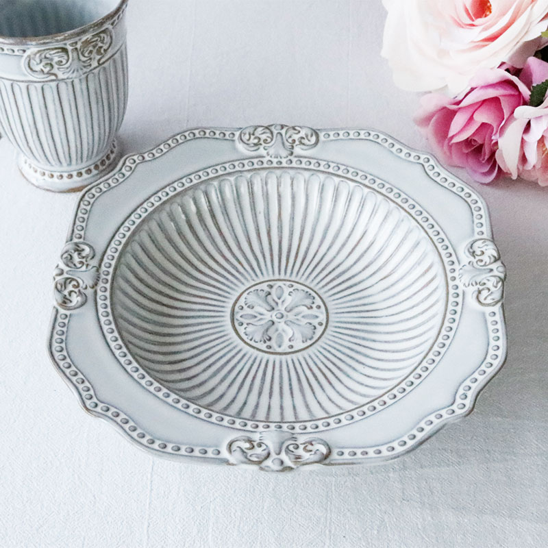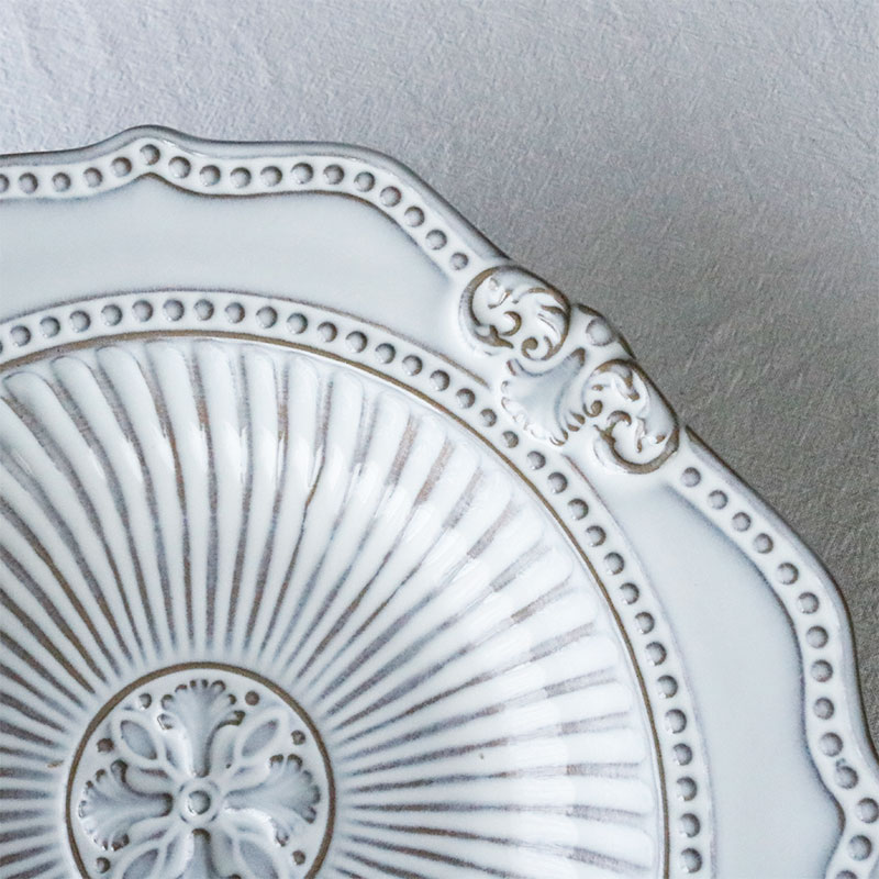 上品なアンティーク調デザインが魅力の深皿プレート。直径24cm・深さ4.5cmで、パスタやカレー、煮物や炒め物など、さまざまな料理にぴったりです。食卓をワンランクアップさせる華やかな雰囲気で、おもてなしやカフェ風の演出にもおすすめ。おしゃれな見た目と実用性を兼ね備えた、毎日使いたくなる万能プレートです。