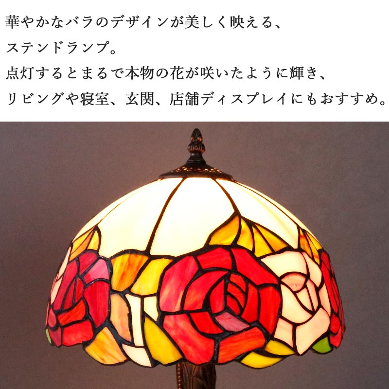 華やかなバラのデザインが美しく映える、ステンドランプ。点灯するとまるで本物の花が咲いたように輝き、リビングや寝室、玄関、店舗ディスプレイにもおすすめ。