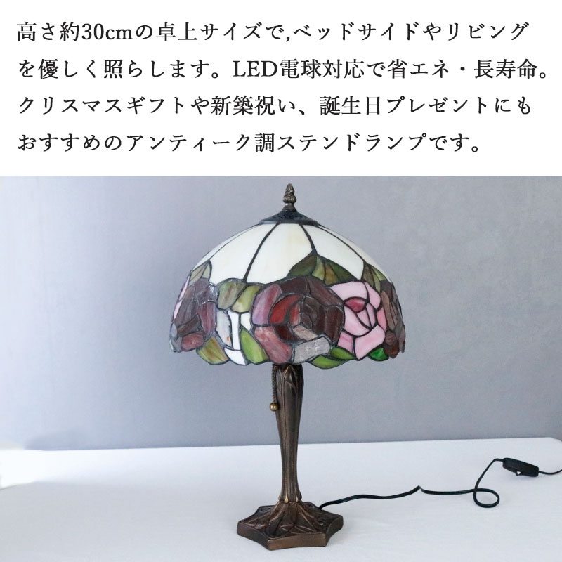 高さ約30cmの卓上サイズで、ベッドサイドやリビングを優しく照らします。LED電球対応で省エネ・長寿命。クリスマスギフトや新築祝い、誕生日プレゼントにもおすすめのアンティーク調ステンドライトです。