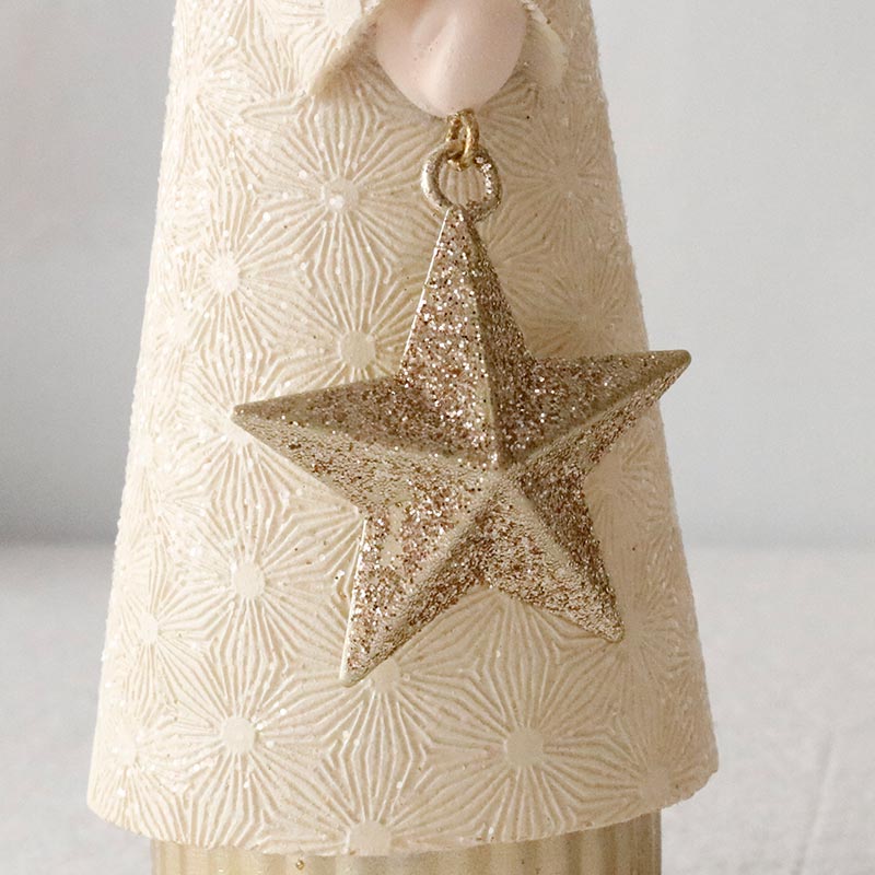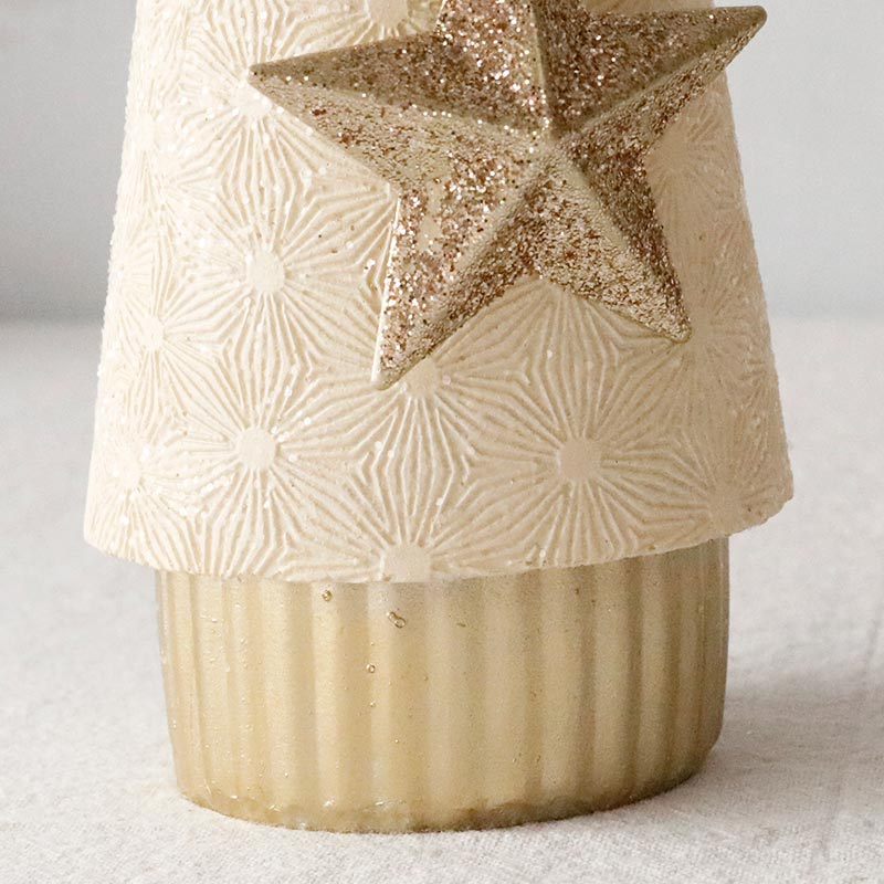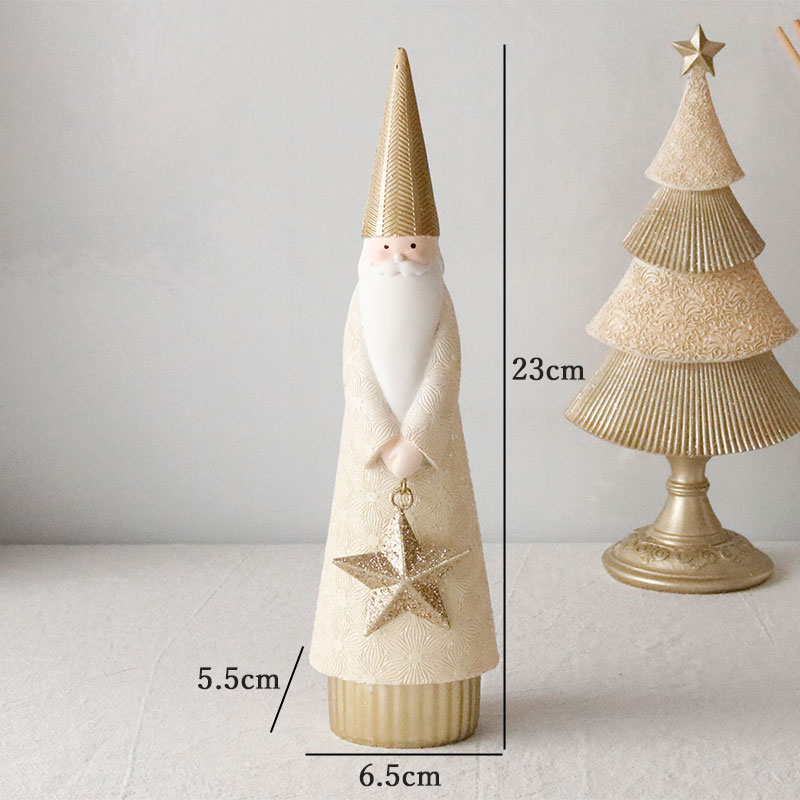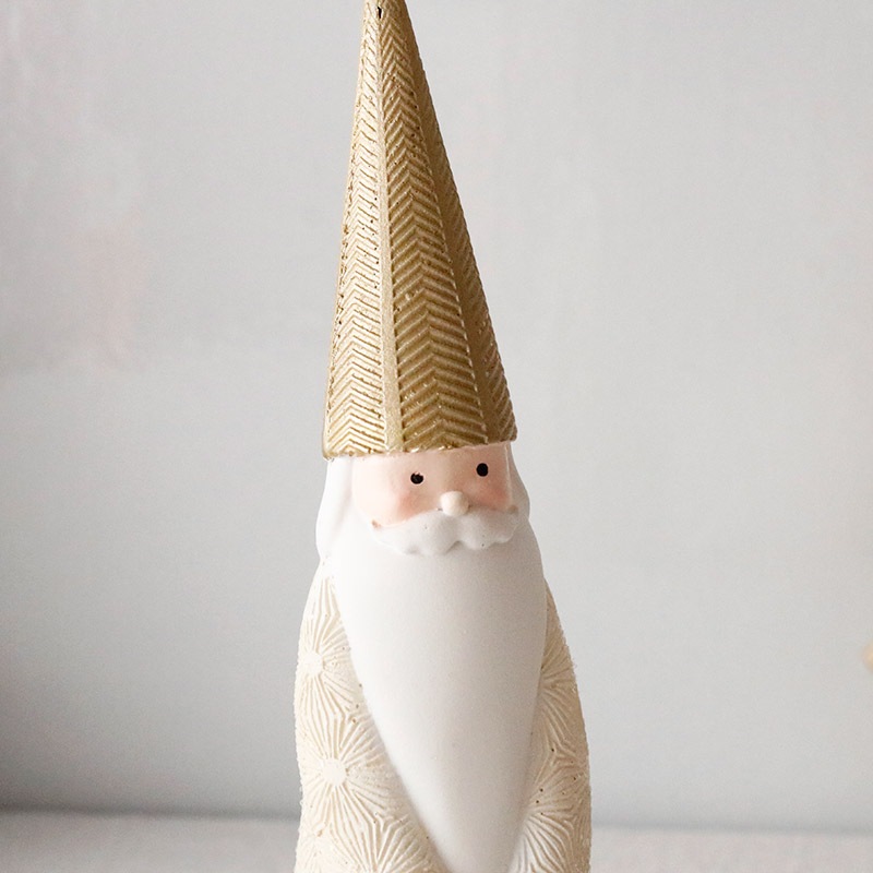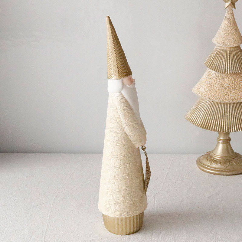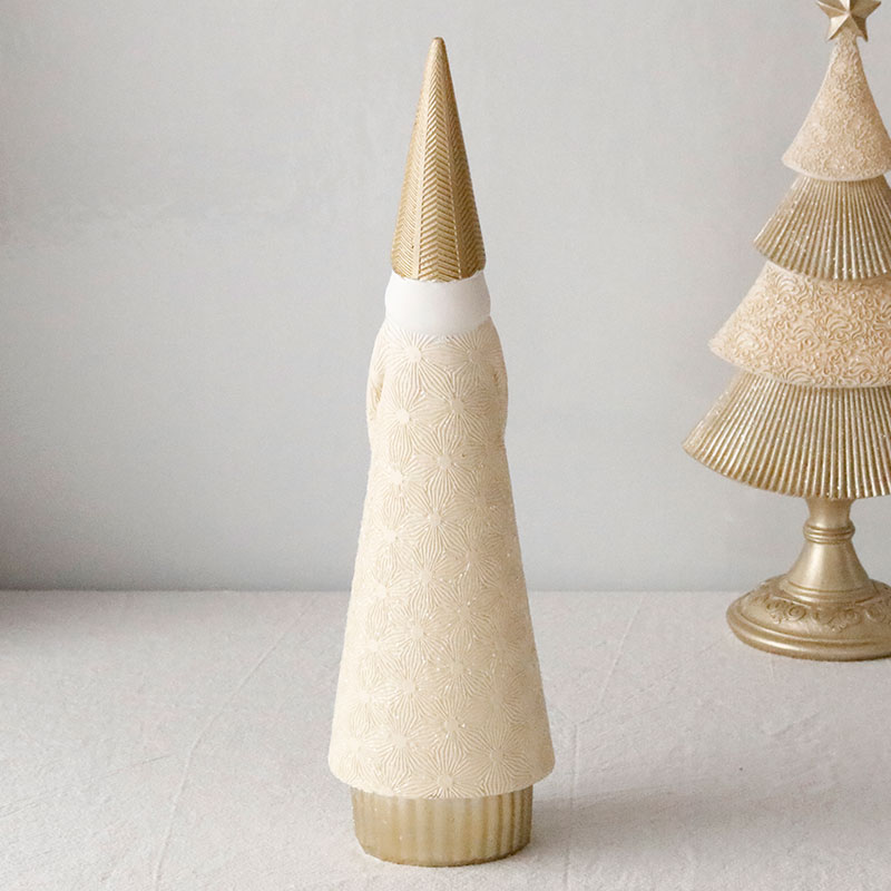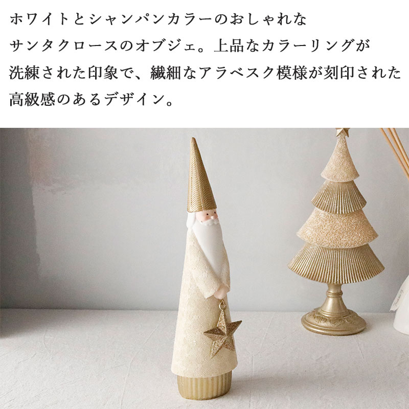 ホワイトとシャンパンカラーのおしゃれなサンタクロースのオブジェ。上品なカラーリングが洗練された印象で、繊細なアラベスク模様が刻印された高級感のあるデザイン。