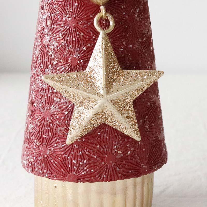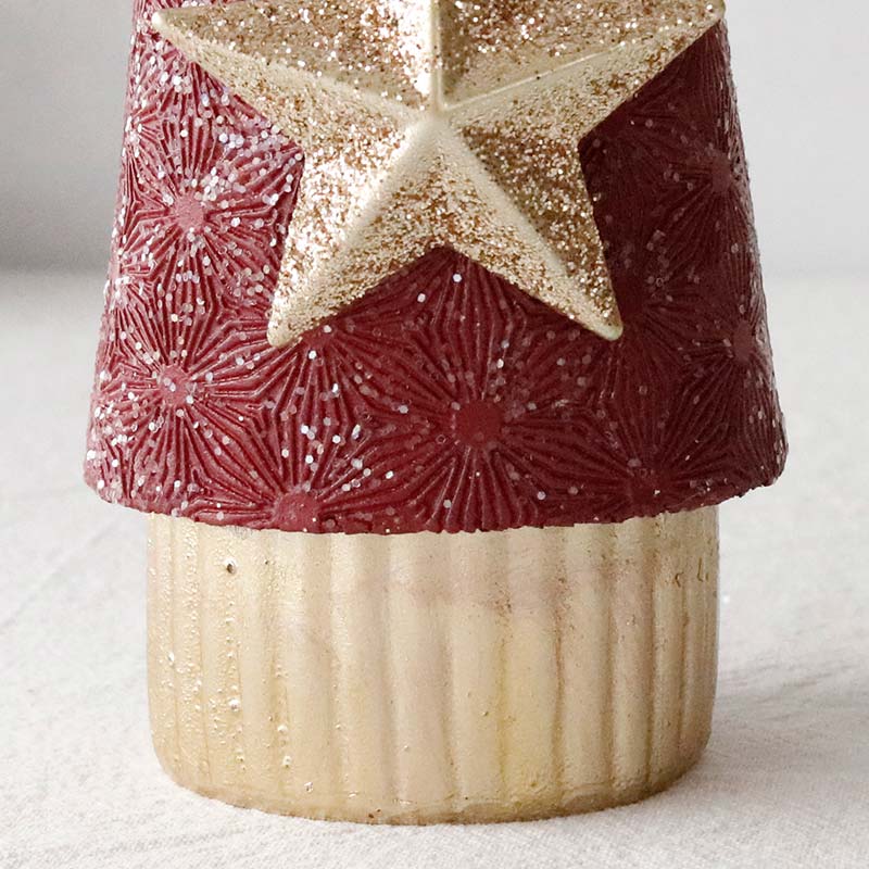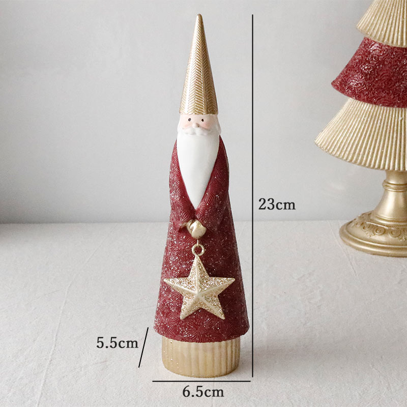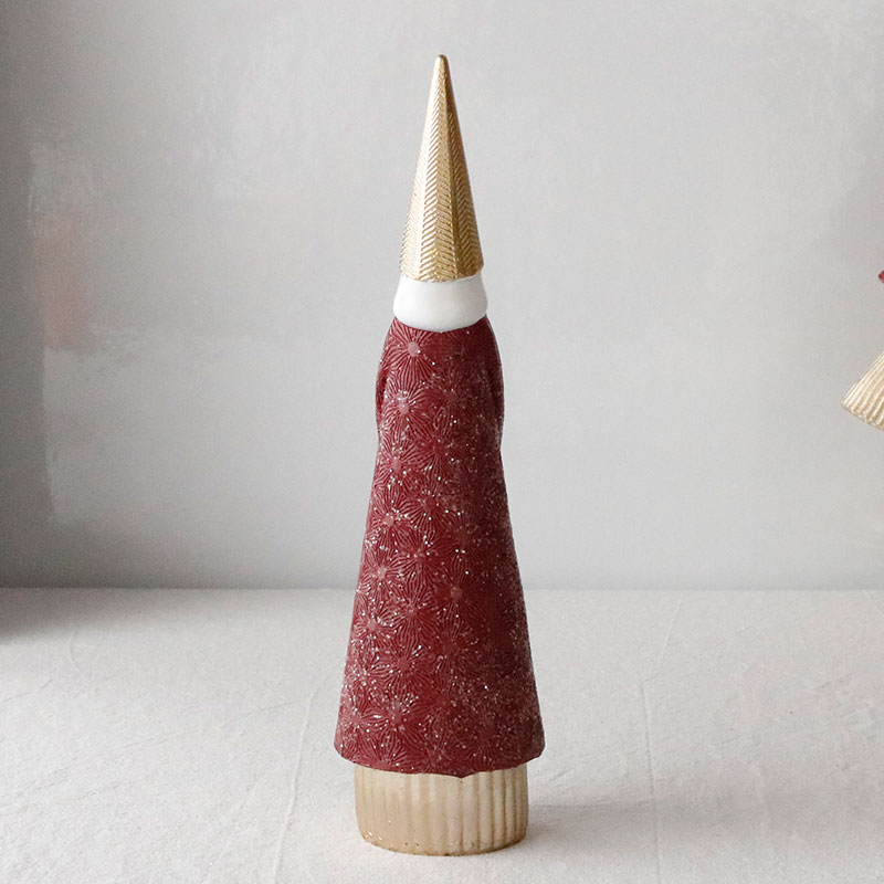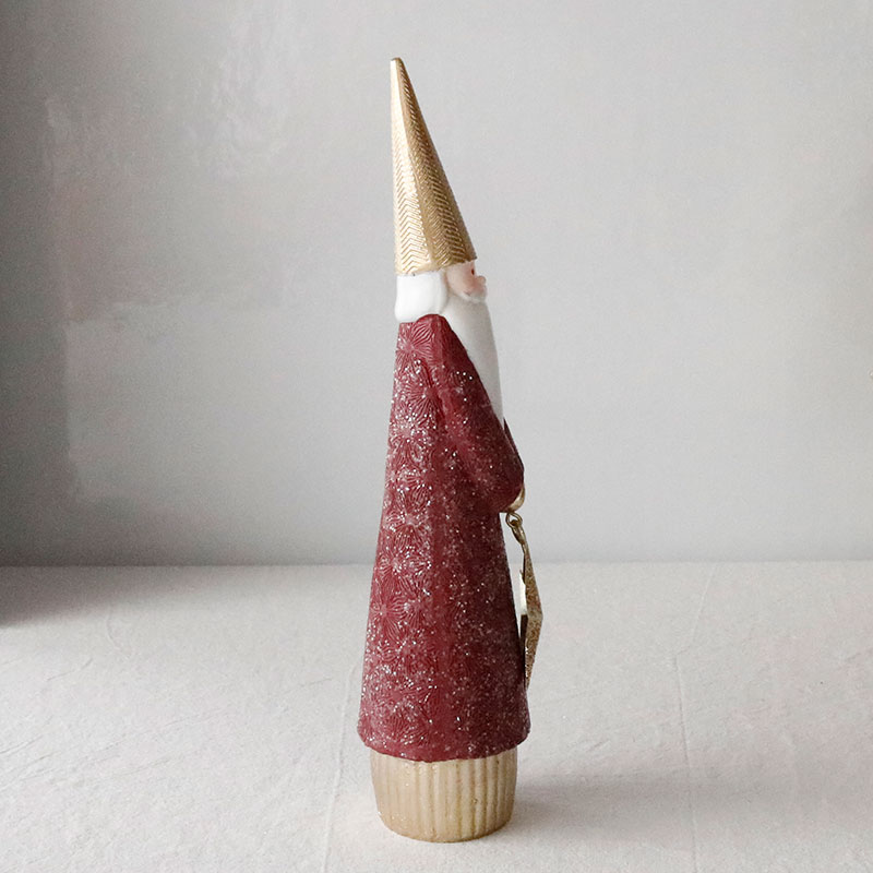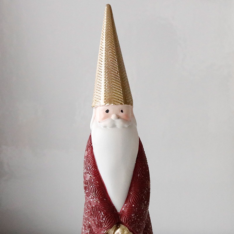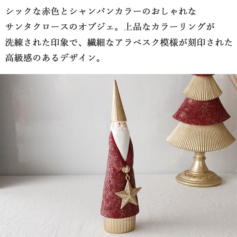 シックな赤色とシャンパンカラーのおしゃれなサンタクロースのオブジェ。上品なカラーリングが洗練された印象で、繊細なアラベスク模様が刻印された高級感のあるデザイン。