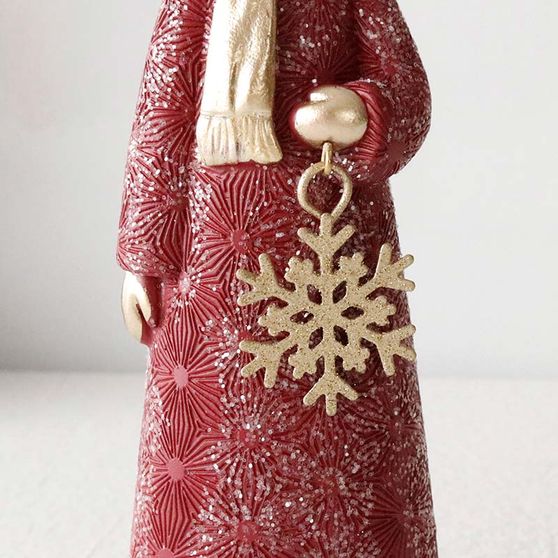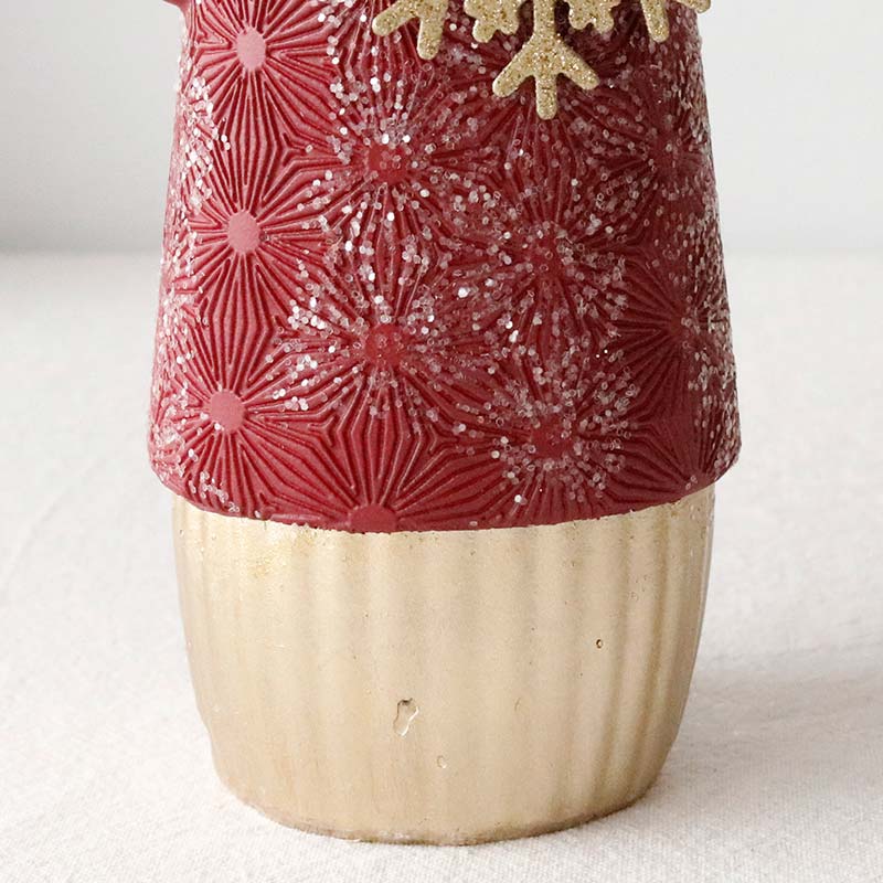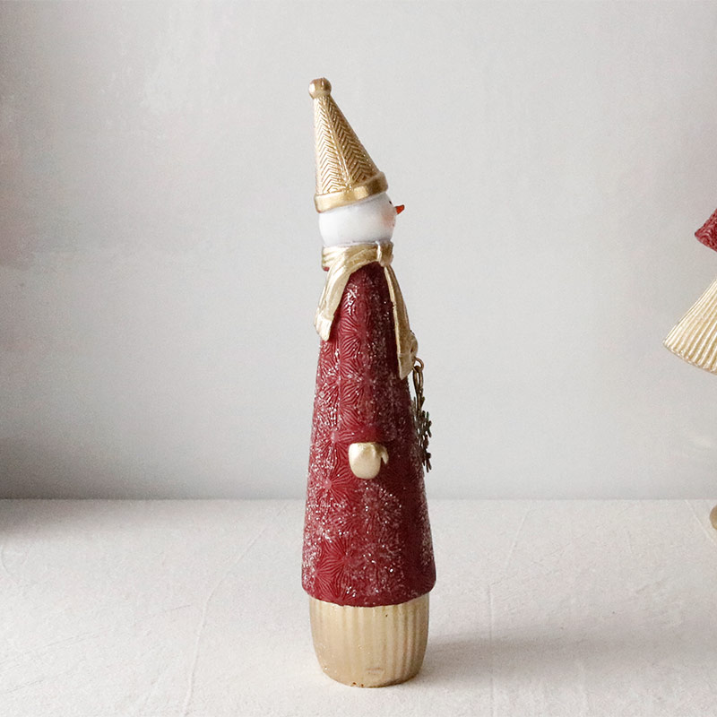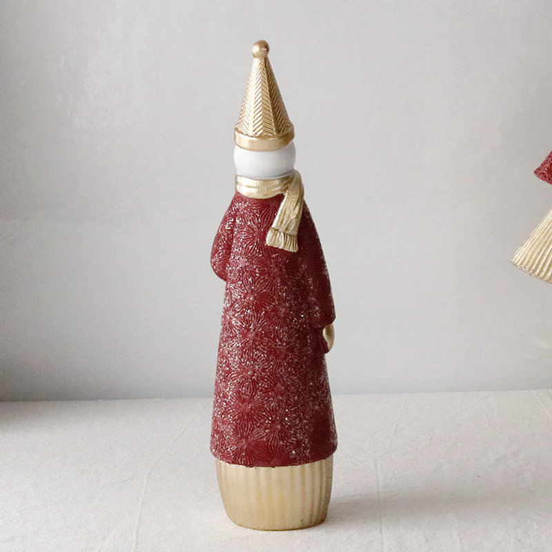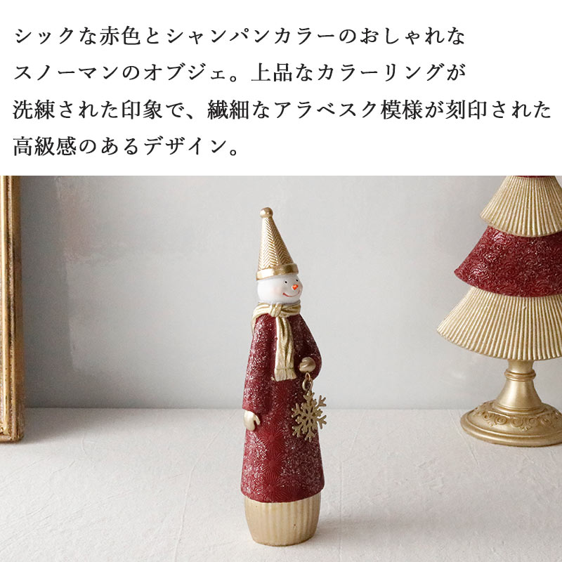 シックな赤色とシャンパンカラーのおしゃれなスノーマンのオブジェ。上品なカラーリングが洗練された印象で、繊細なアラベスク模様が刻印された高級感のあるデザイン。