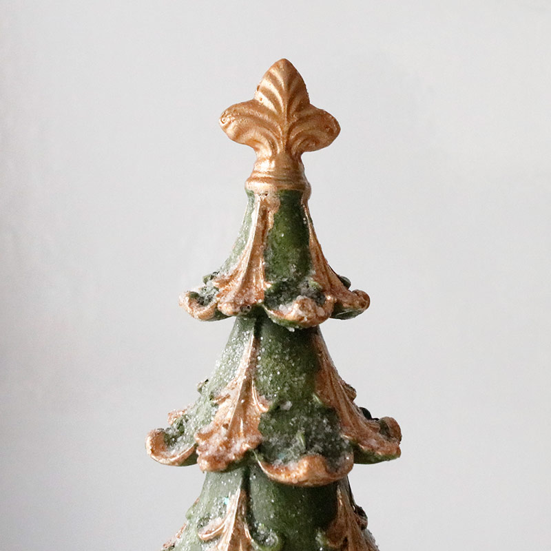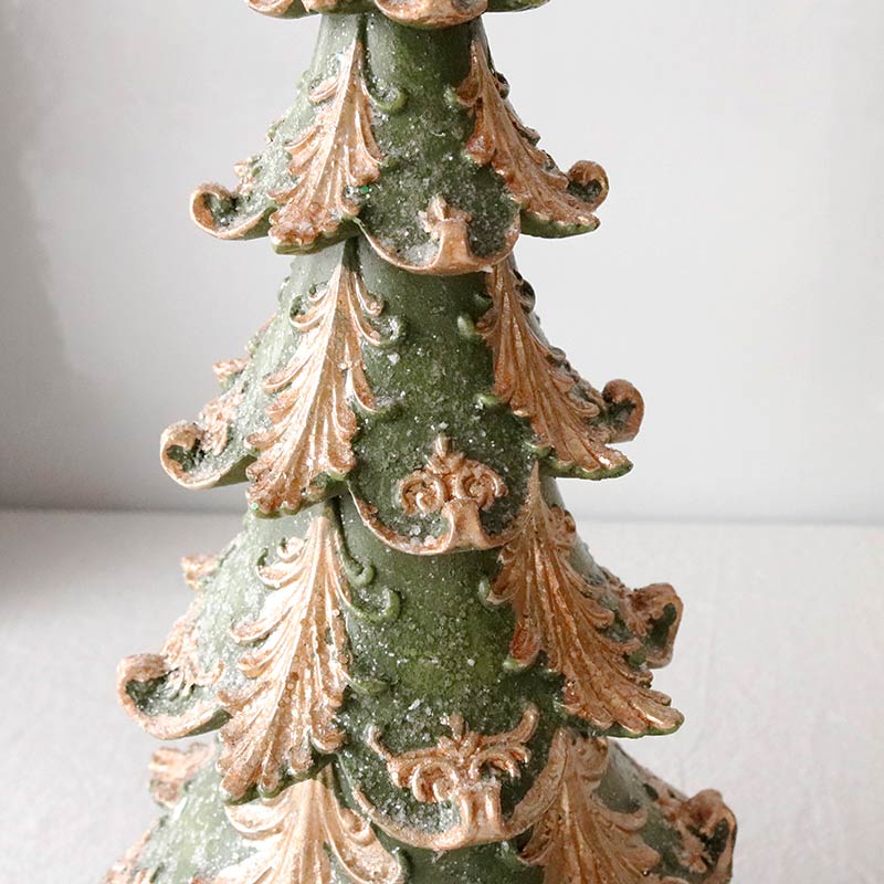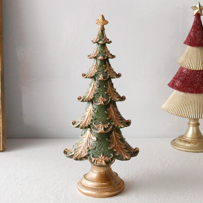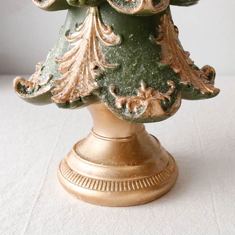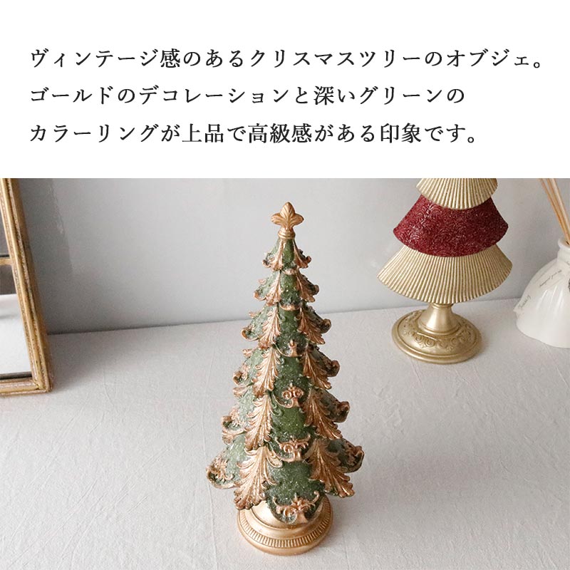 ヴィンテージ感のあるクリスマスツリーのオブジェ。ゴールドのデコレーションと深いグリーンのカラーリングが上品で高級感のある印象です。