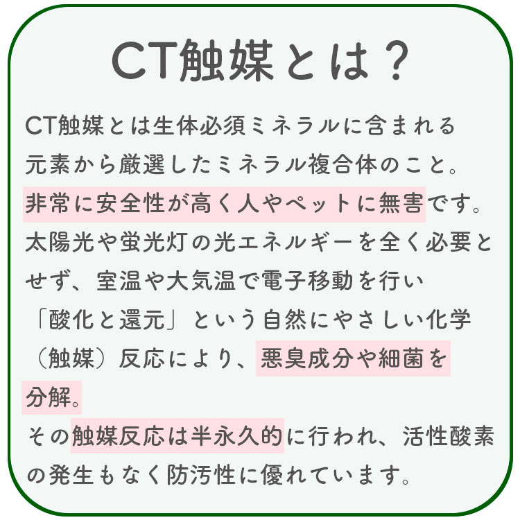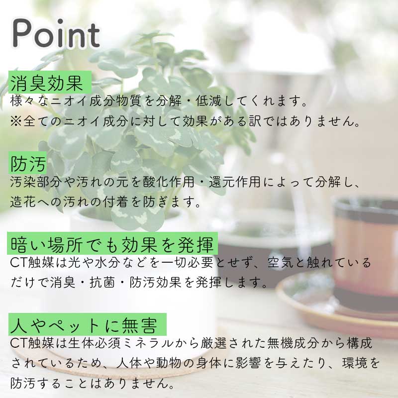 - 葉の表面にホコリがたまりすぎると、CT触媒が空気に触れにくくなり効果が弱まりますので,ホコリがたまった場合は葉の表面をはたき柔らかく乾いた布などで優しく払いとってください。強くこすりすぎると、CT触媒コーティンが剥がれて効果が損なわれる恐れがありますのでご注意ください。