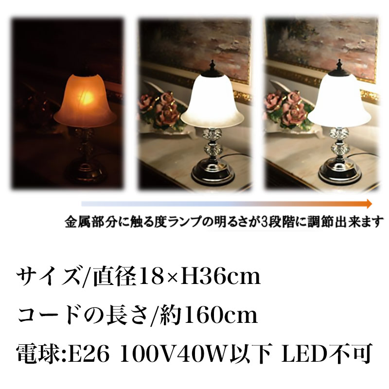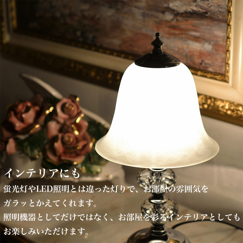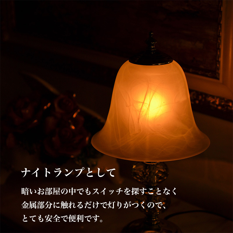 暗いお部屋の中でスイッチを探すことなく金属部分に触れるだけで明かりがつくので、安全で便利です。蛍光灯やLED照明とは違った灯りで、お部屋の雰囲気をガラッとかえてくれます。照明機器としてだけでなく、お部屋を彩るインテリアとしてもお楽しみいただけます。