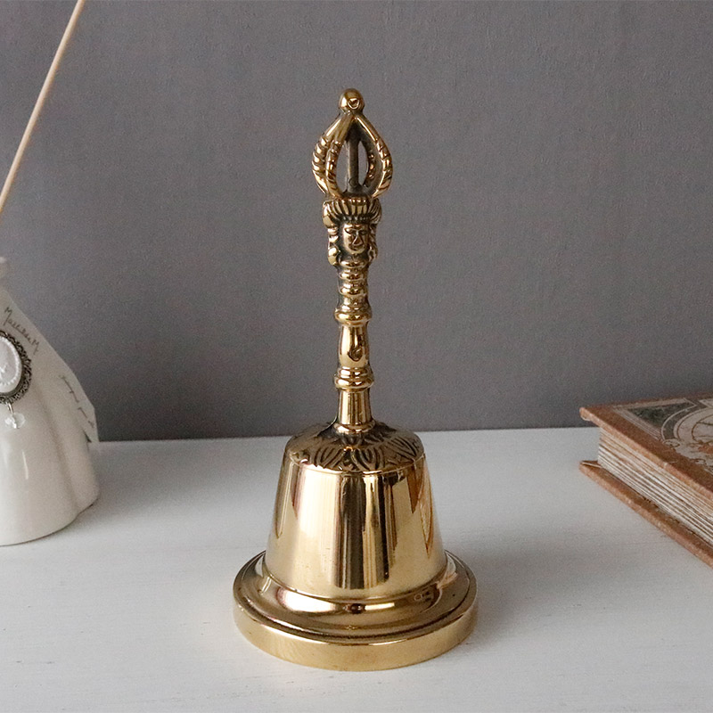 真鍮の無垢」が使用されたハンドベル。ハンドル部分には彫刻が施されており、クラシカルで高級感があります。