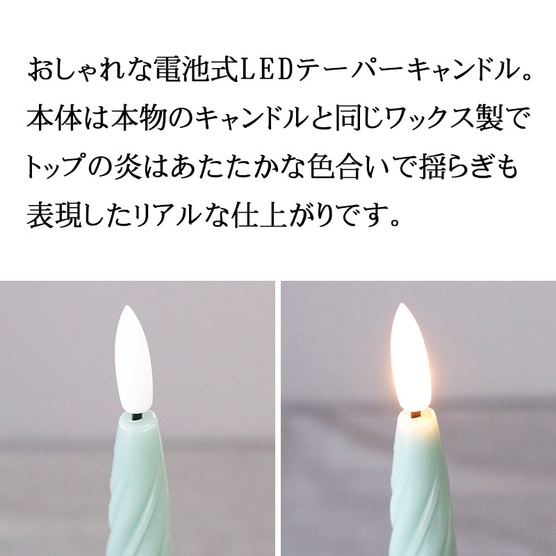 おしゃれな電池式LEDテーパーキャンドル。本体は本物のキャンドルとと同じワックス製で、トップの炎はあたたかな色合いで揺らぎも表現したリアルな仕上がりです。