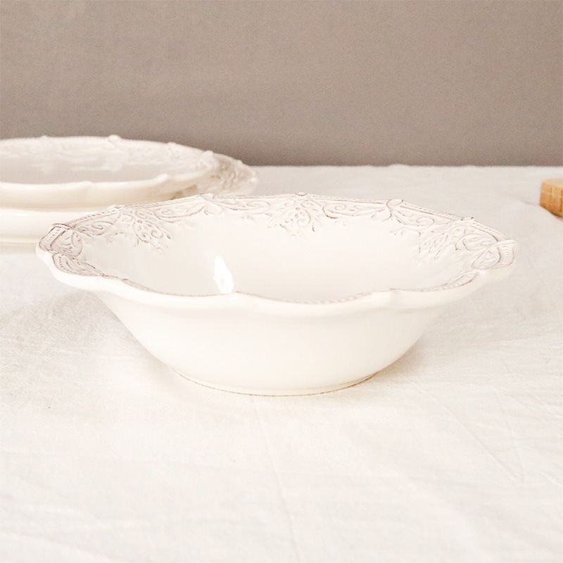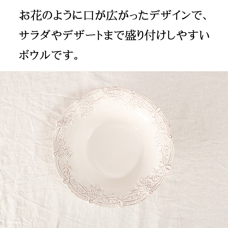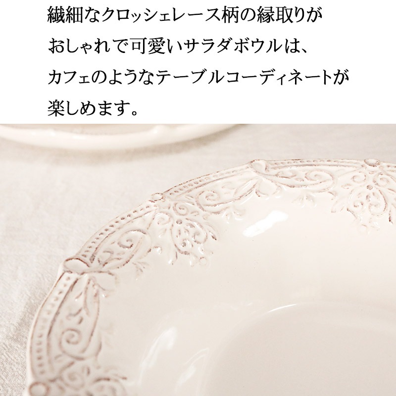 繊細なクロッシェレース柄の縁取りがおしゃれで可愛いサラダボウルは、カフェのようなテーブルコーディネートが楽しめます。