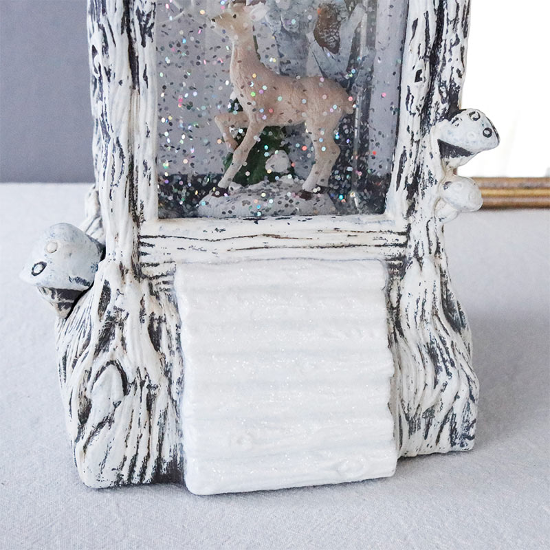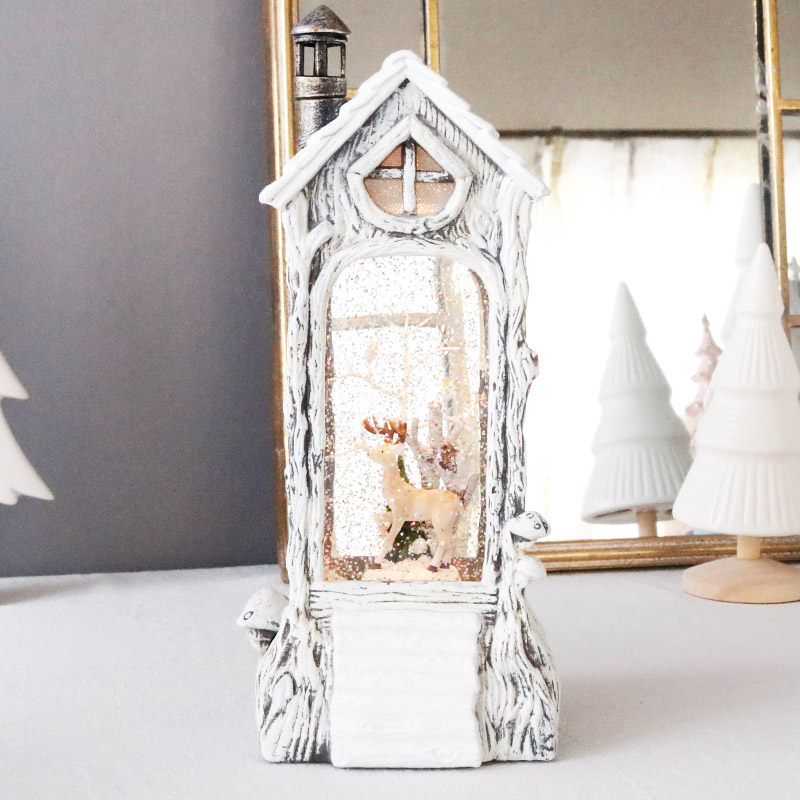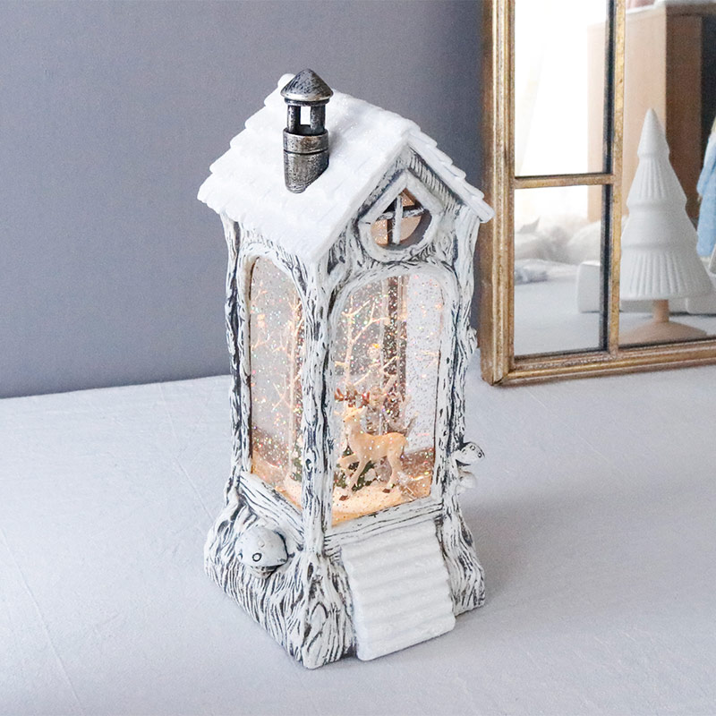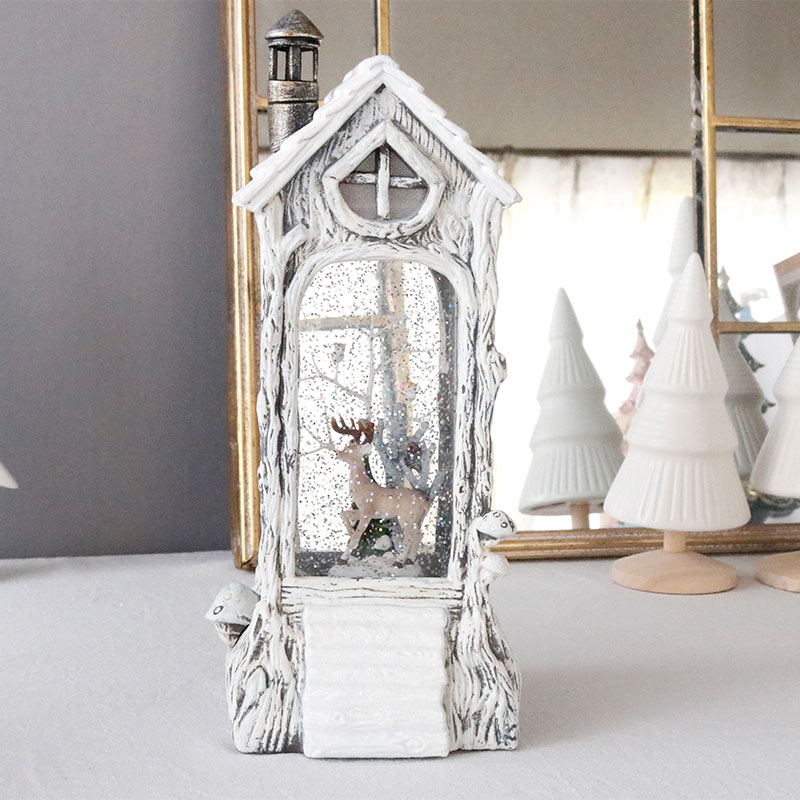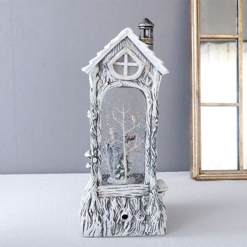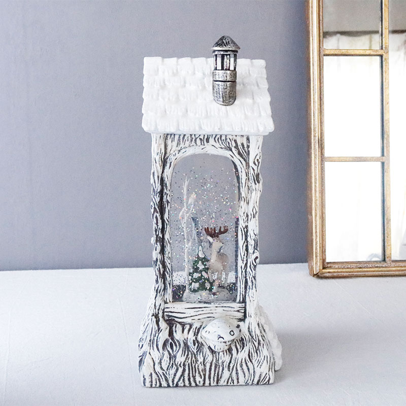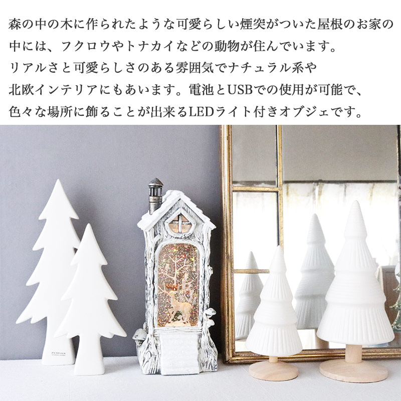 森の中の木に作られたような可愛らしい煙突のついた屋根のお家の中には、フクロウやトナカイなどの動物が住んでいます。