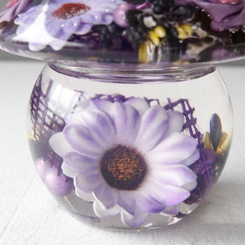 マウスブロウで形成されたガラスの器に彩り豊かな花々や、植物、フルーツなどのモチーフやビーズが封じ込められたデザイン。
