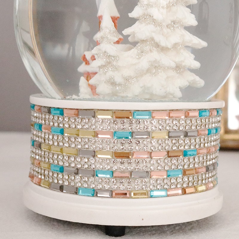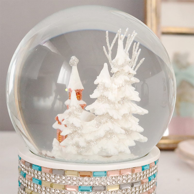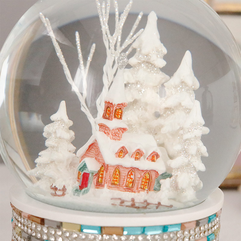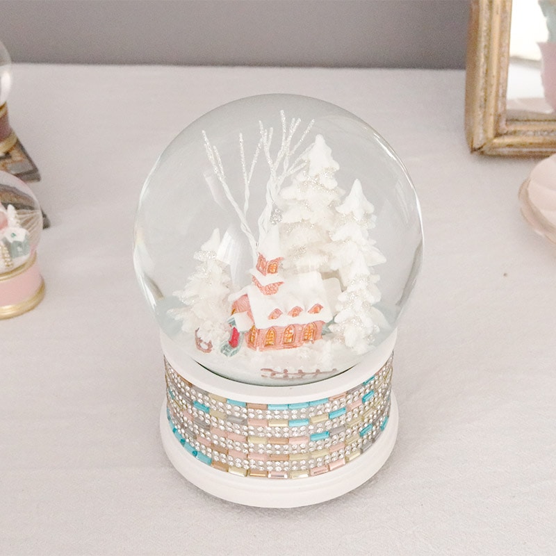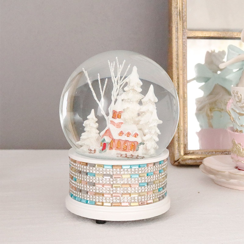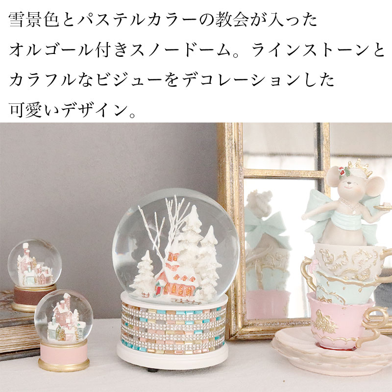 雪景色とパステルカラーの教会が入ったオルゴール付きスノードーム。ラインストーンとカラフルなビジューをデコレーションした可愛いデザイン。