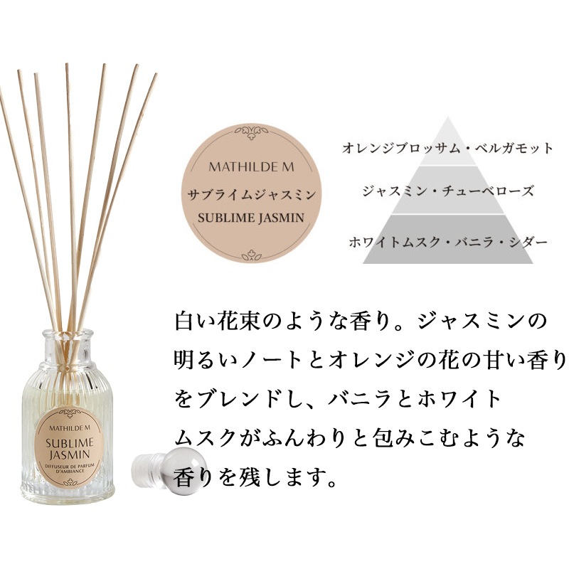 ジャスミンの明るいノートとオレンジの花の香りをブレンドし、バニラとホワイトムスクがふんわりと包みこむような香りを残します。