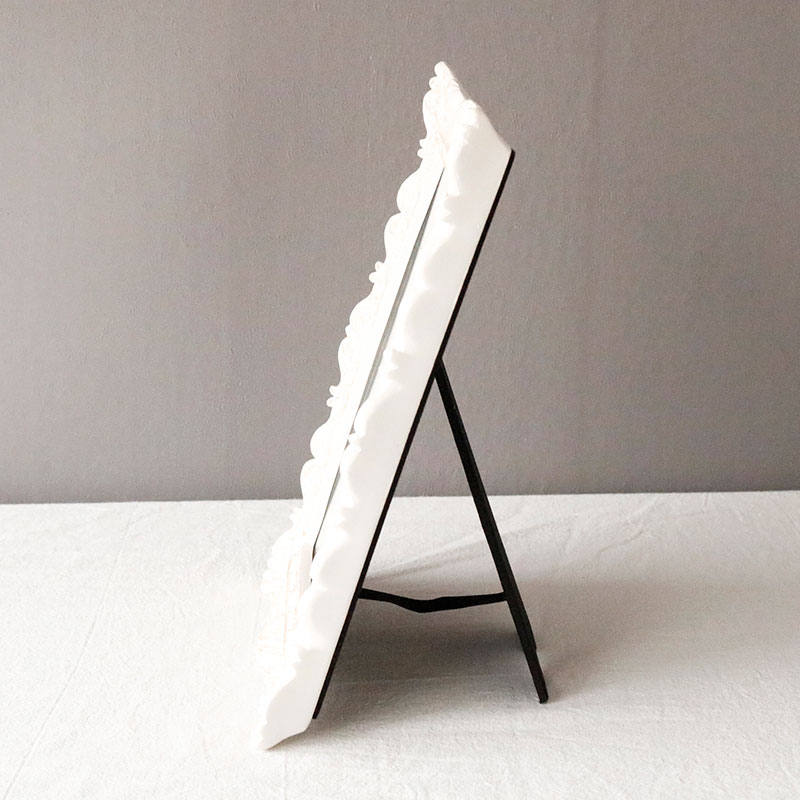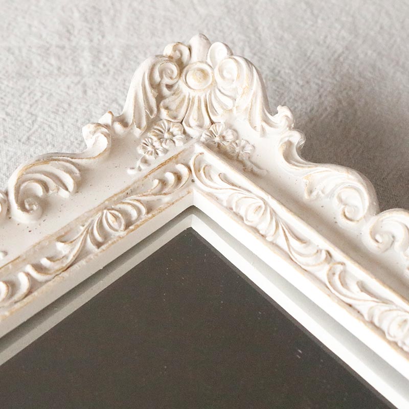 クラシカルなアラベスクのレリーフを装飾したおしゃれなスタンドミラー。毎日の身支度に使いやすいサイズ感です。
