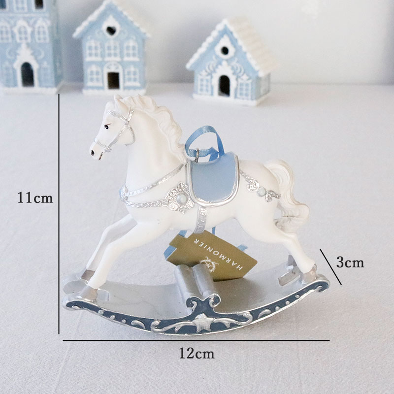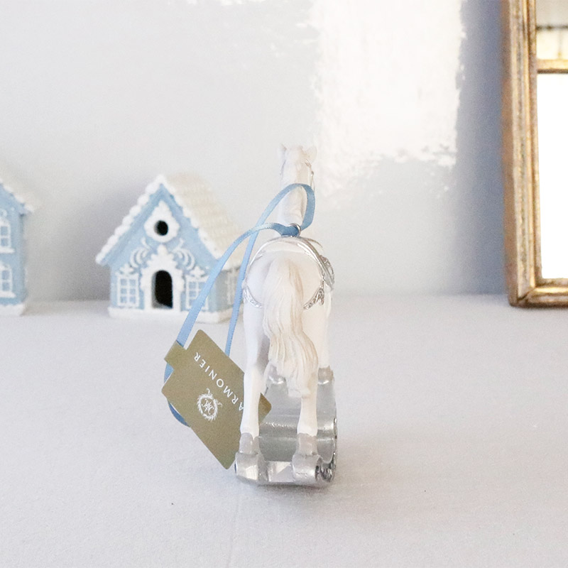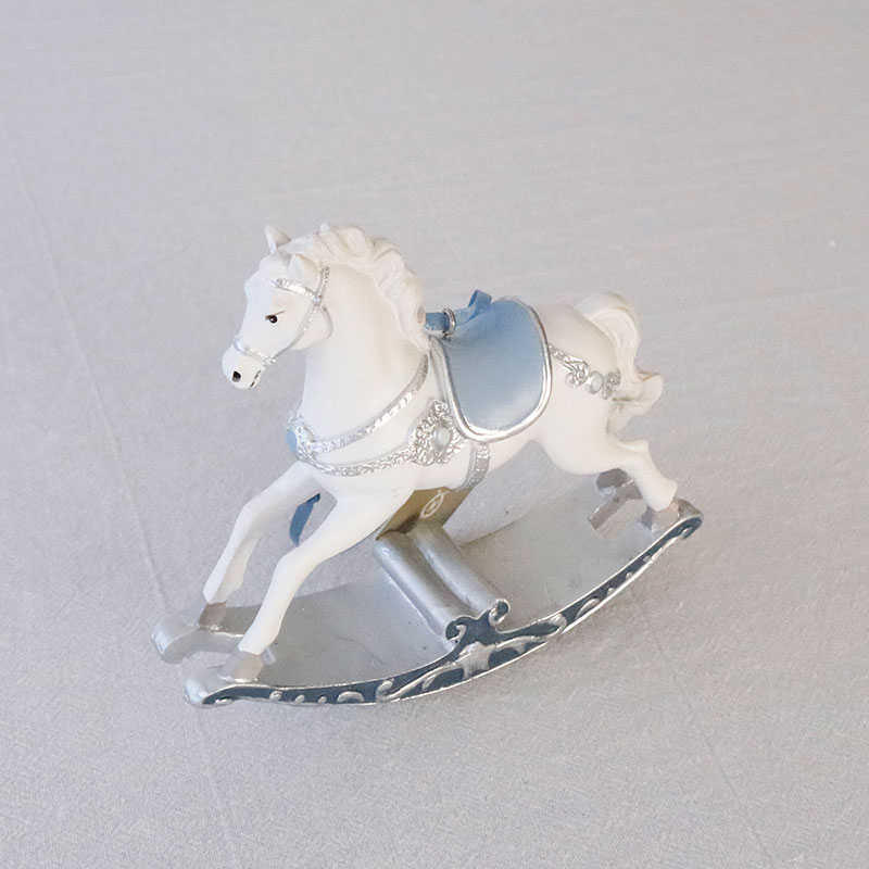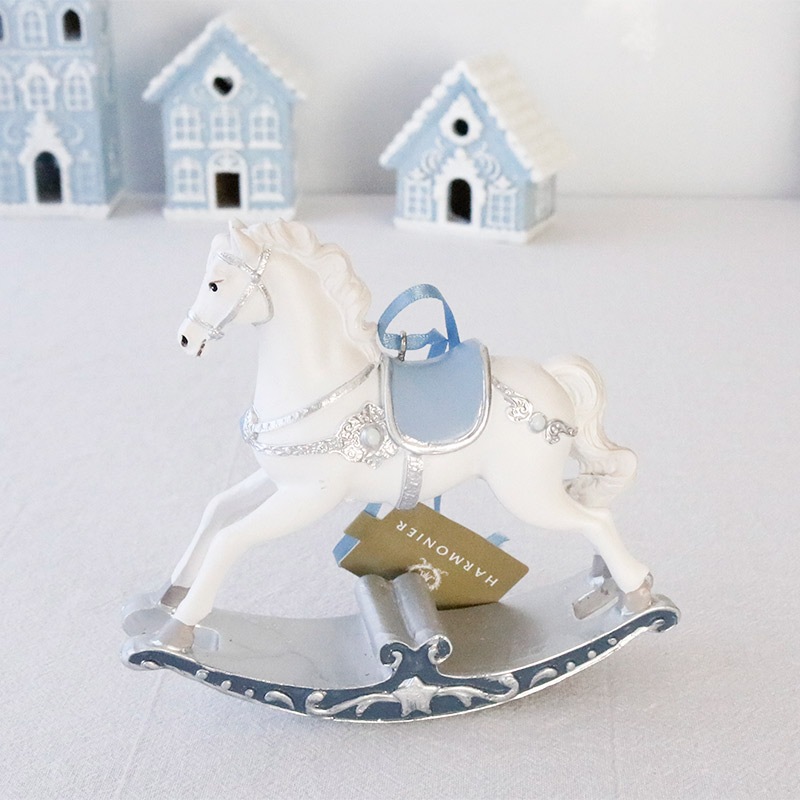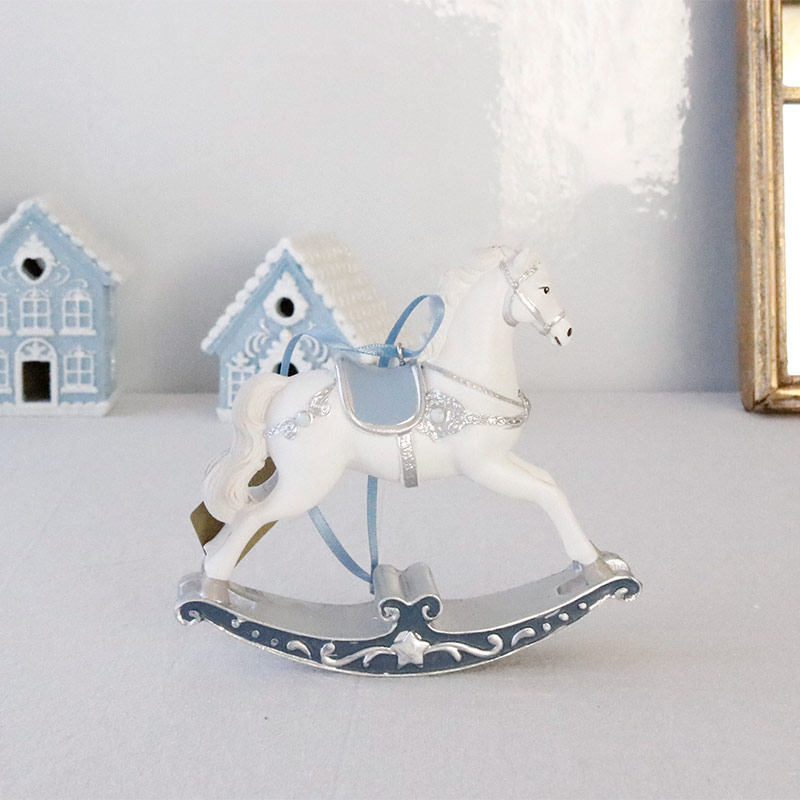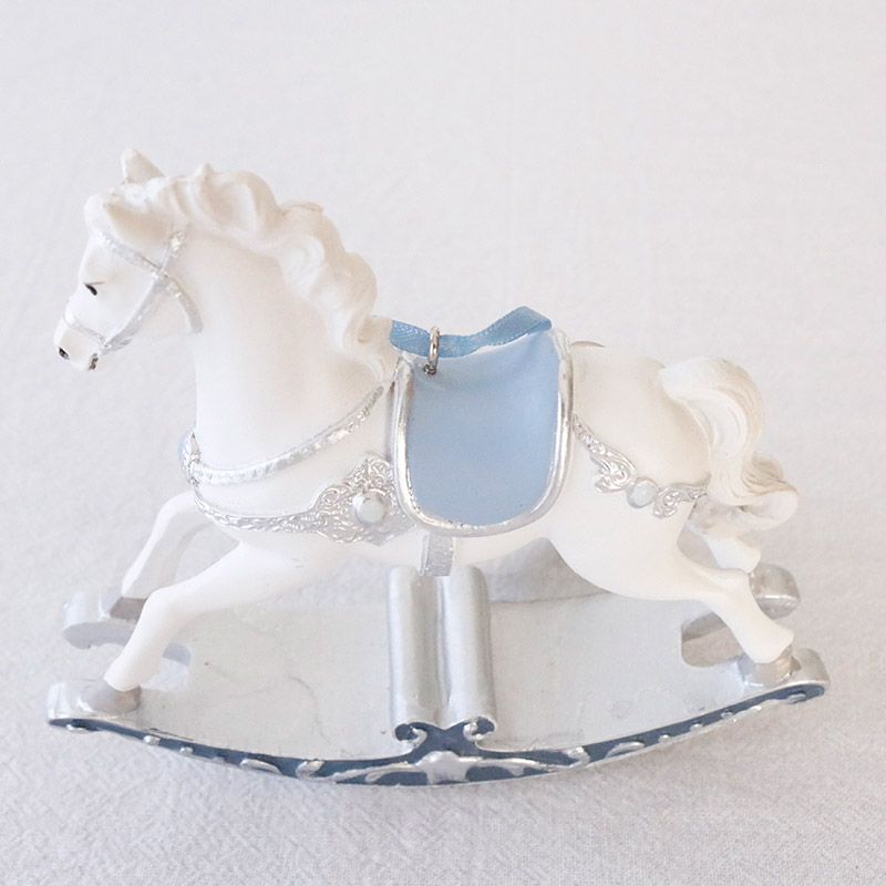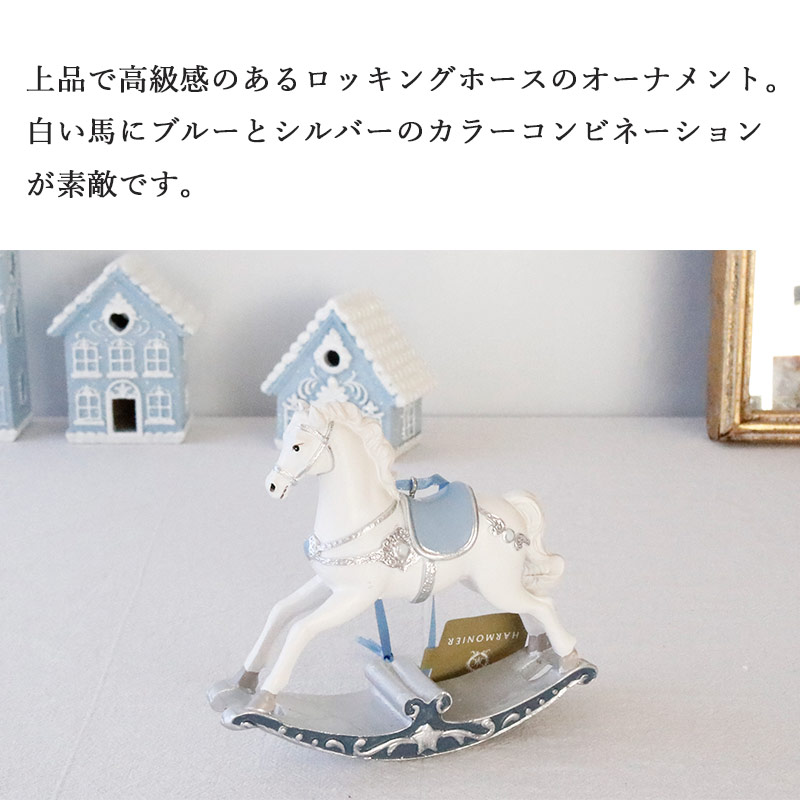 上品で高級感のあるロッキングホースのオーナメント。白い馬にブルーとシルバーのカラーコンビネーションが素敵です。