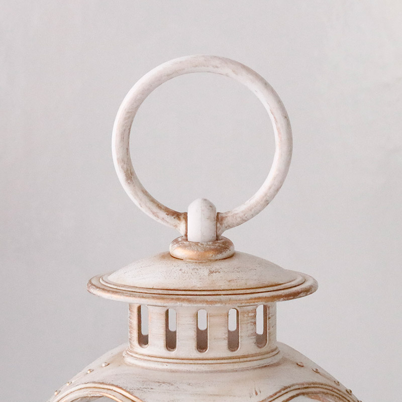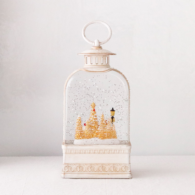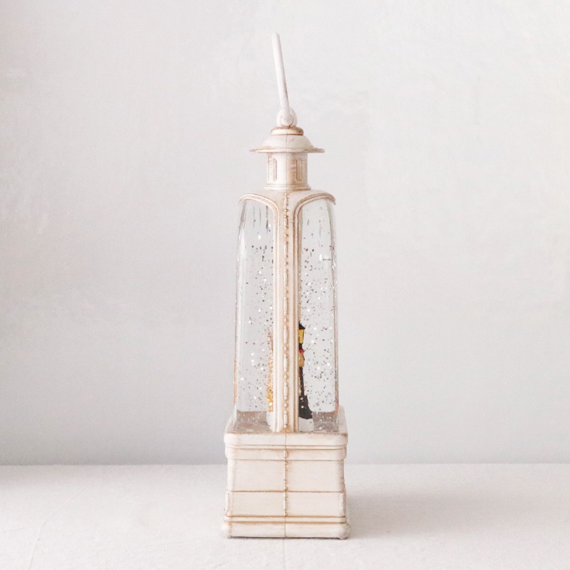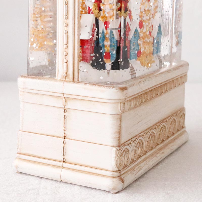 パステルカラーの街並みが入ったクラシカルな白いランタンのオルゴールオブジェ。スイッチを入れると中のラメが舞い、クリスマスソングがメドレーで流れ幻想的な雰囲気です。