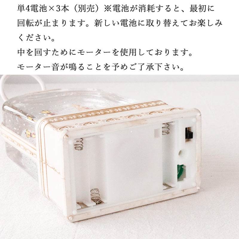 単4電池×3本(別売)※電池が消耗すると、最初に回転が止まります。新しい電池に取り替えてお楽しみください。中を回すためにモーターを使用しております。モーター音が鳴ることを予めご了承下さい。
